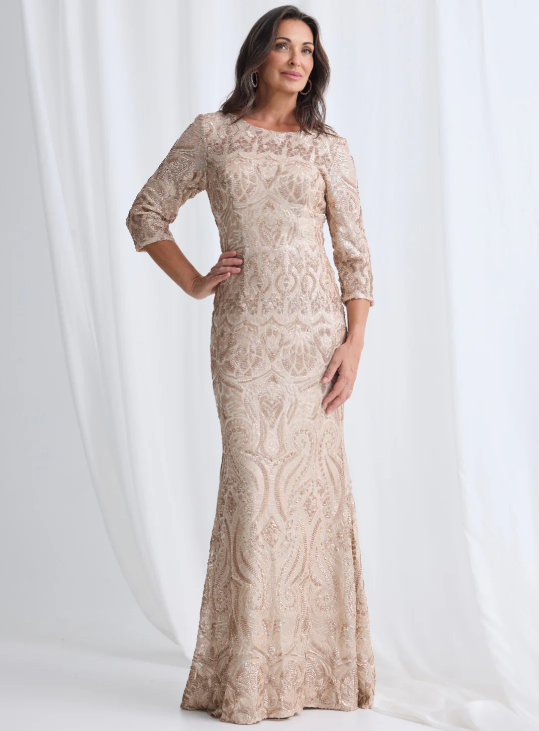 Roxy evening Gown with long sleeves by Trellis Lane - Champagne $499