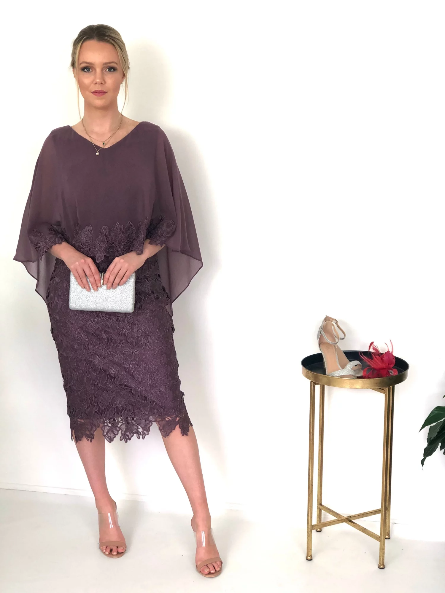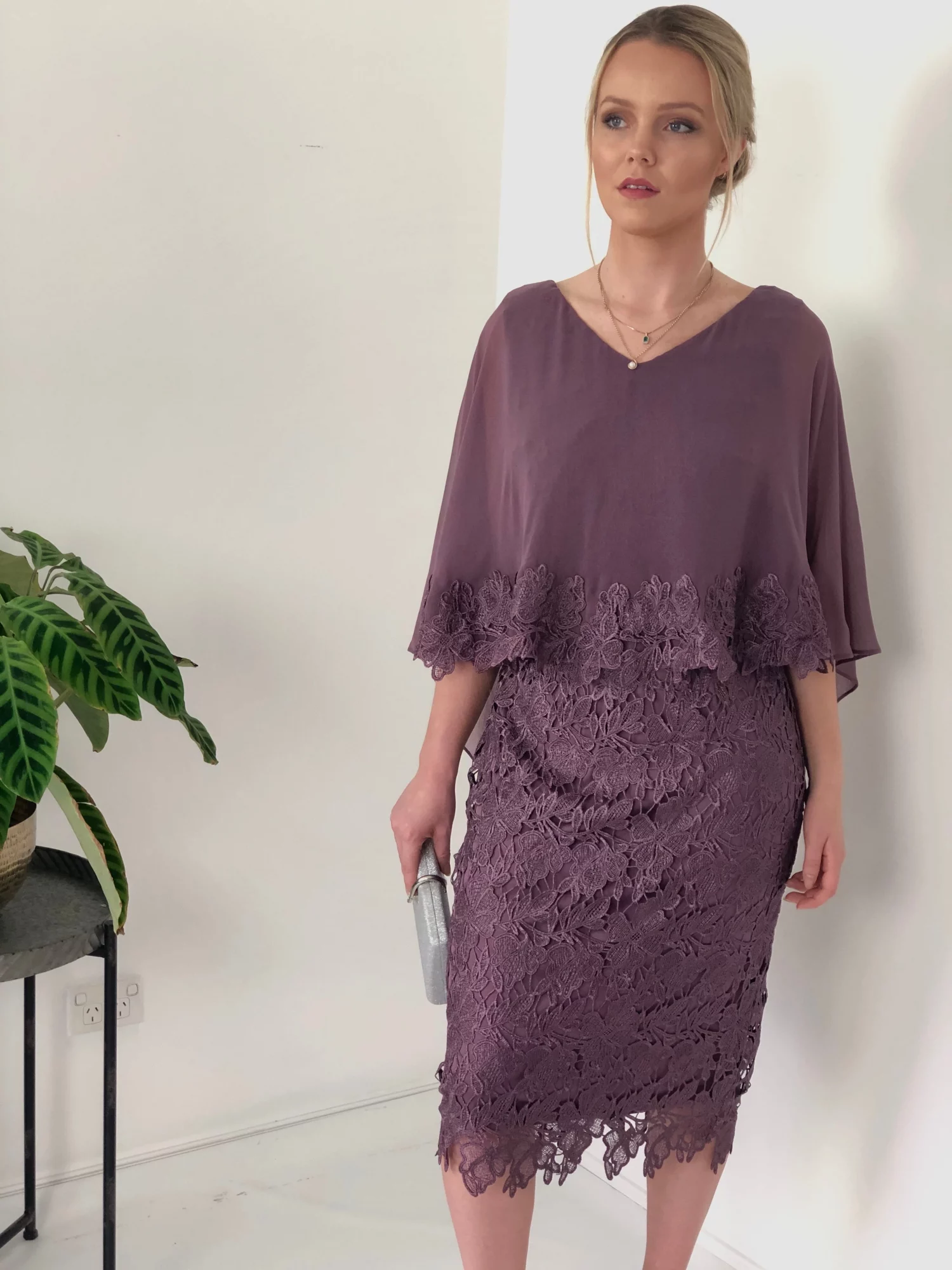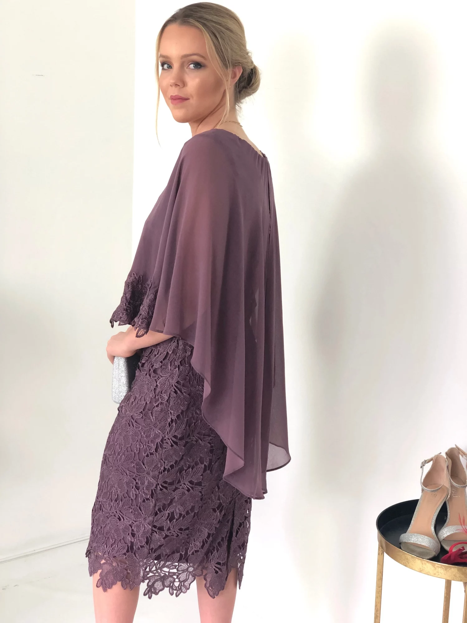 Feel like a goddess in this creative and feminine style! Made in a full Venice lace, a lace embellished chiffon layer falls softly over the shoulders and drapes down the back. The jersey inside dress comfortably shape your curves. Team with silver or nude heels to complete the glamorous look.