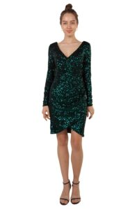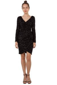 This lovely long sleeved V-neck cocktail dress with shirring across the tummy is made with a stretch seqinned fabric making it very comfortable to wear.