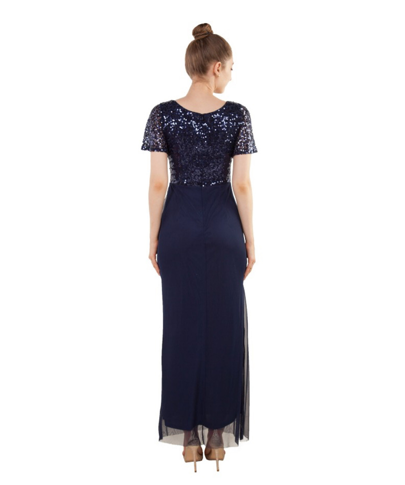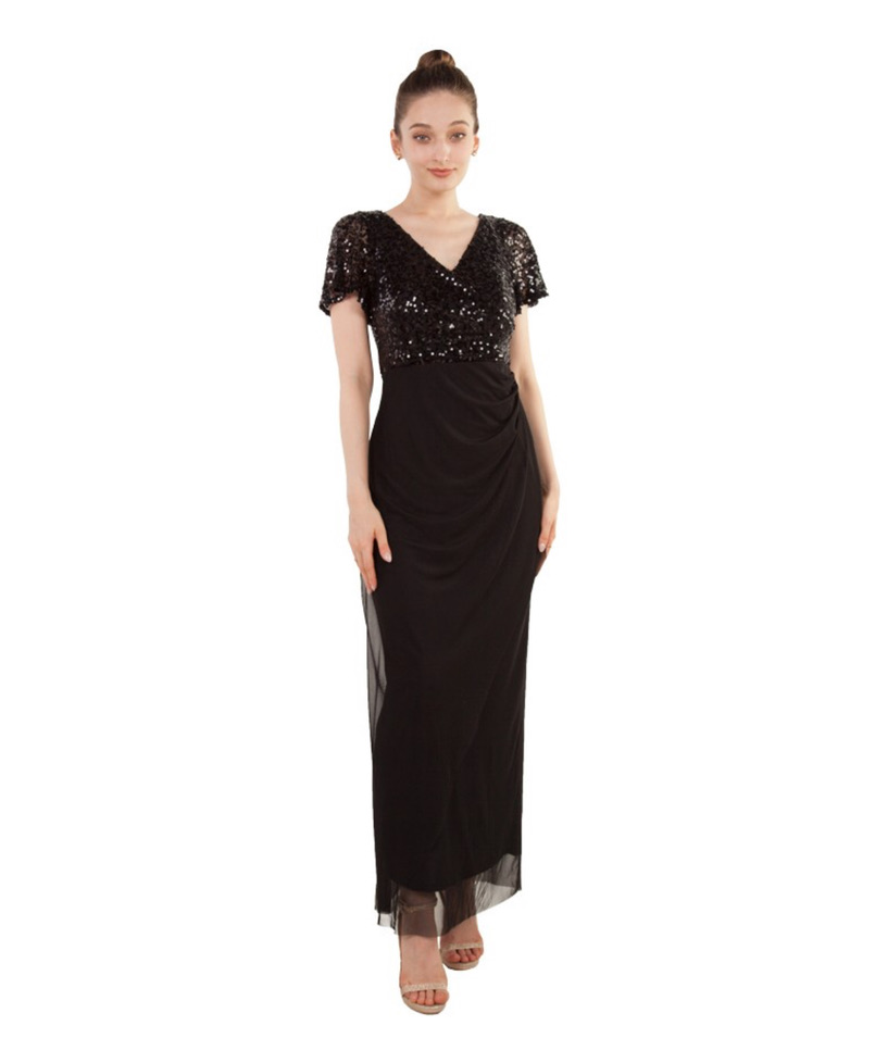 Elegance meets effortless style with our Style 222454 evening gown, available in timeless Navy and classic Black. This stunning full-length dress features a shimmering sequin bodice with short sleeves for just the right amount of coverage, balanced by a soft tulle overlay skirt that drapes beautifully over the body. The flattering V-neckline and gathered waist detail create a slimming silhouette, making this gown perfect for formal occasions, weddings, or evening events.