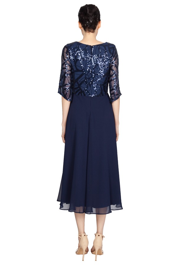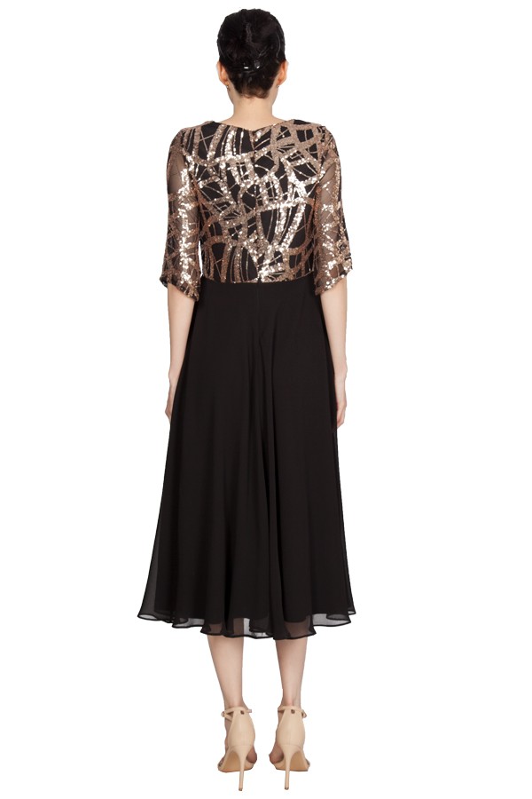 Available in classic black with rose gold sequins and navy with tonal sequins, this dress is ideal for mothers of the bride or groom, evening events, and formal celebrations.