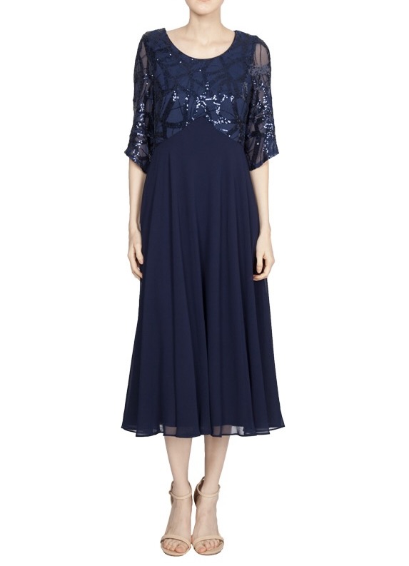 chiffon A-line dress, sequin bodice formal dress, ¾ sleeve evening dress, mother of the bride dress Australia, navy sequin midi dress, black sequin cocktail dress, wedding guest dress Australia.