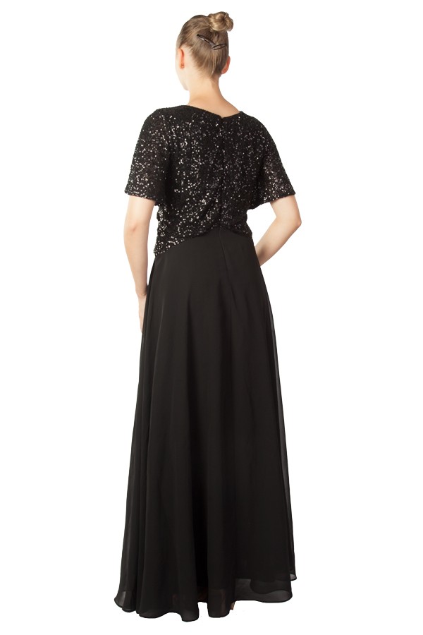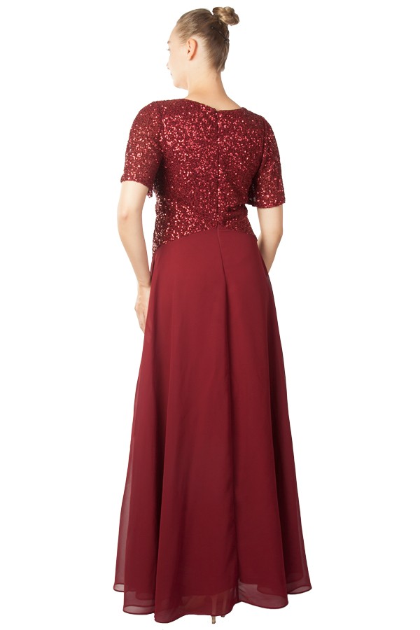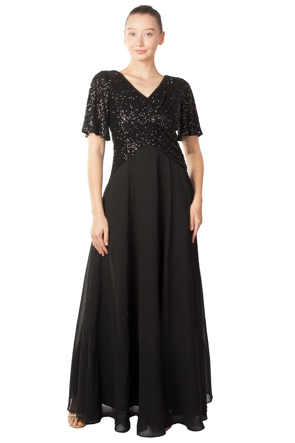 The bodice features a refined sequin overlay with a soft V-neckline, adding just the right amount of sparkle. Short flutter sleeves offer elegant arm coverage, while the gently shaped waistline flows into a full-length chiffon skirt for graceful movement and a flattering A-line silhouette. Available in sizes 10-26.