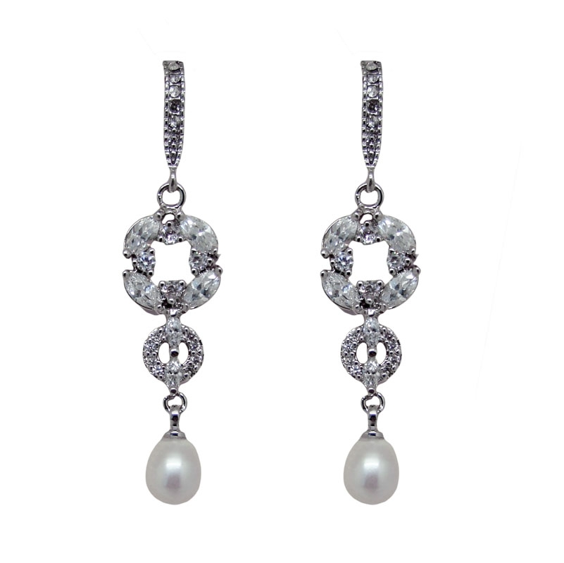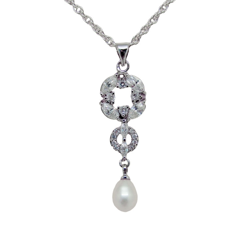A GORGEOUS CUBIC ZIRCONIA AND FRESH WATER PEARL EARRINGS AND NECKLACE SET.