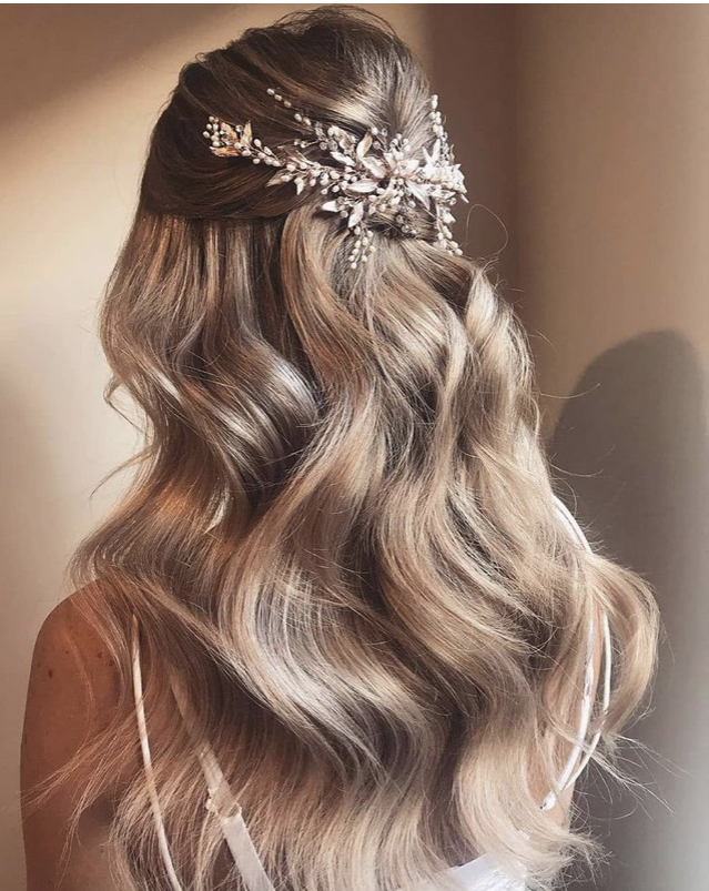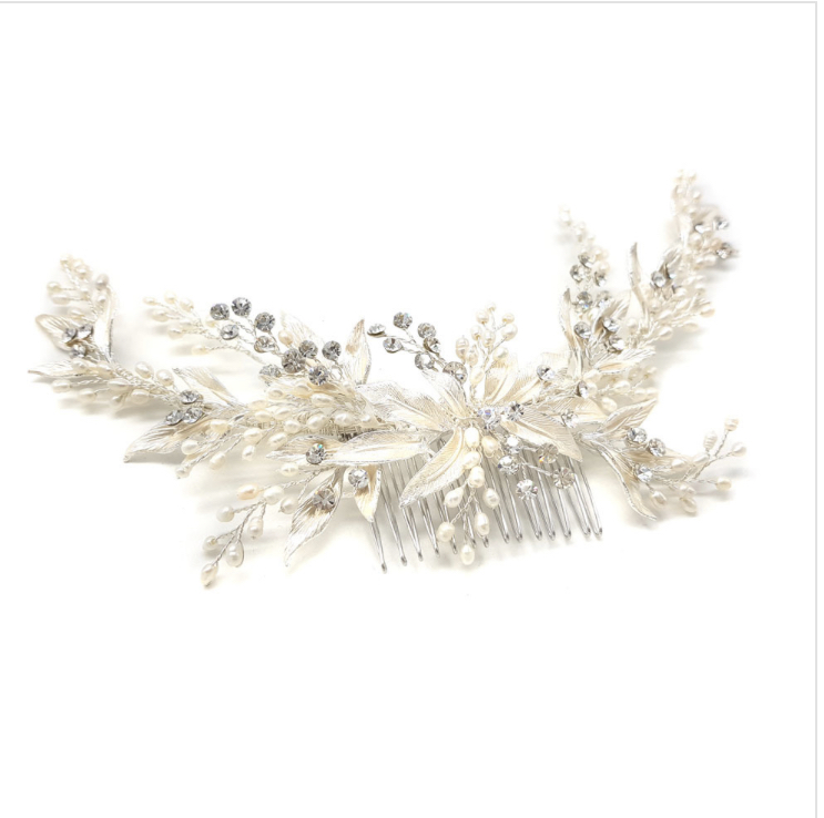 FALL IN LOVE WITH AMELIA’S ENCHANTING DESIGN ORNAMENTED WITH FRESHWATER PEARLS AND SPARKLING CRYSTALS. LEAVES ARE DELICATELY HAND PAINTED.