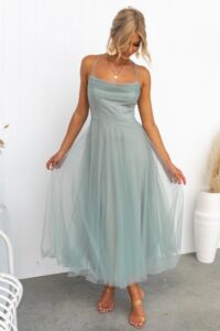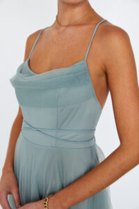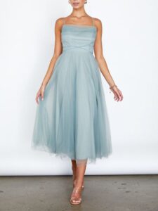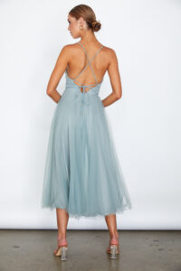 this lovely A-line cocktail dress we named Anastasia has an overlay of fine soft Tulle and a cross cross back