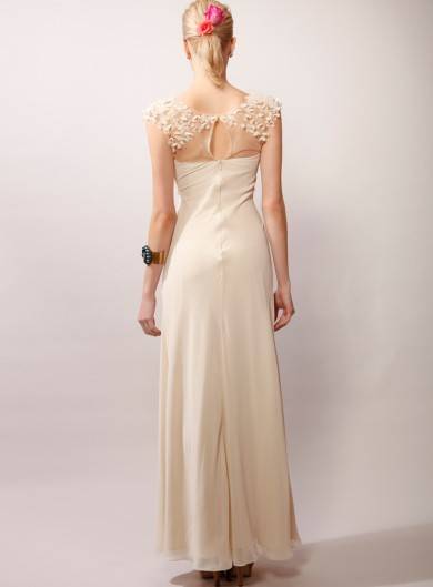 Delicate full length dress with sheer mesh upper with petal detailing on shoulders. Sweetheart neckline with concealed back zip. Fully lined.