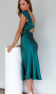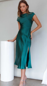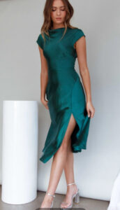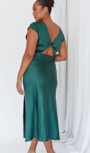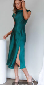 Our elegant Johanna Jade cocktail dress is sure to turn heads. It has a twist detail on the open back which allows you to wear a bra. It’s a clever design, made with a beautifully weighted satin which flows gently over your body. As it has no stretch, it falls well and may hide a few bumps. The leg Split is towards the right side of this gorgeous dress.