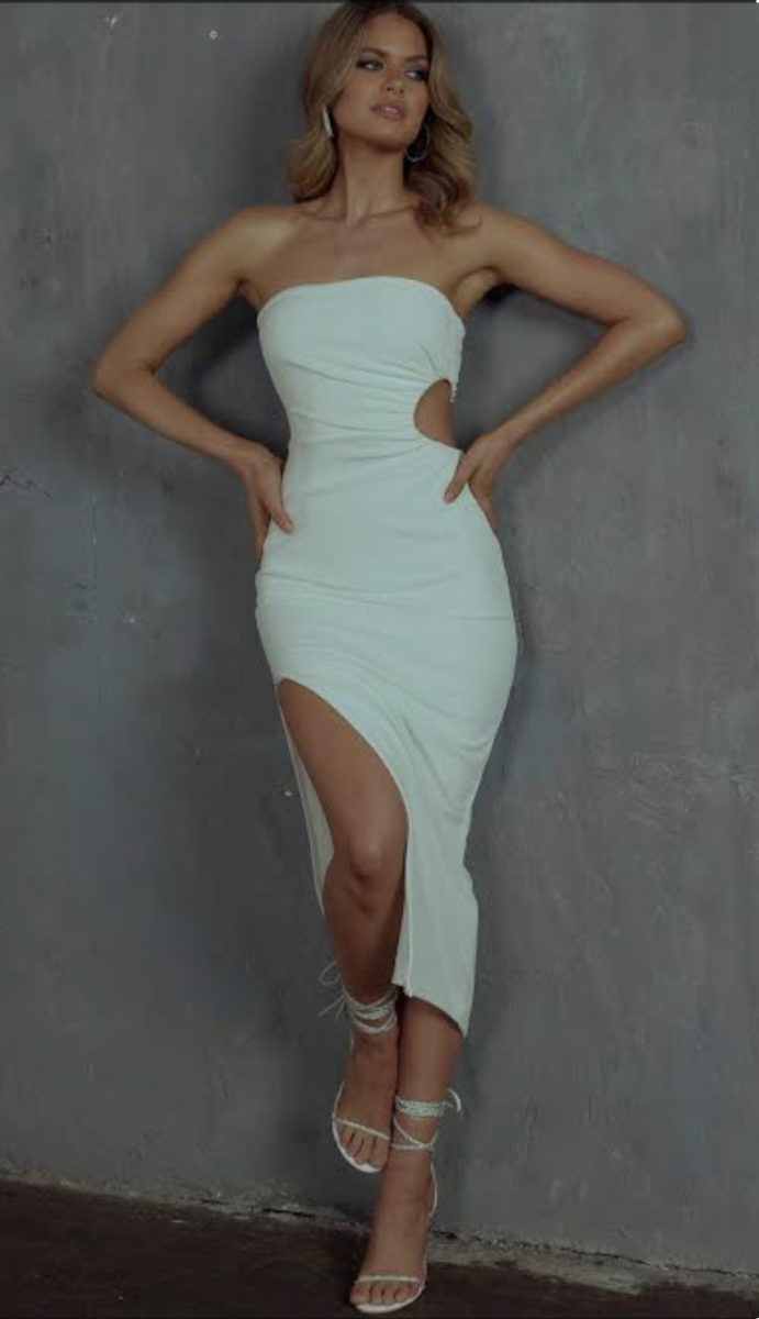 this lovely Jolie strapless cocktail dress is very fitted and has cut outs on the waist. It has a nice high leg side split.