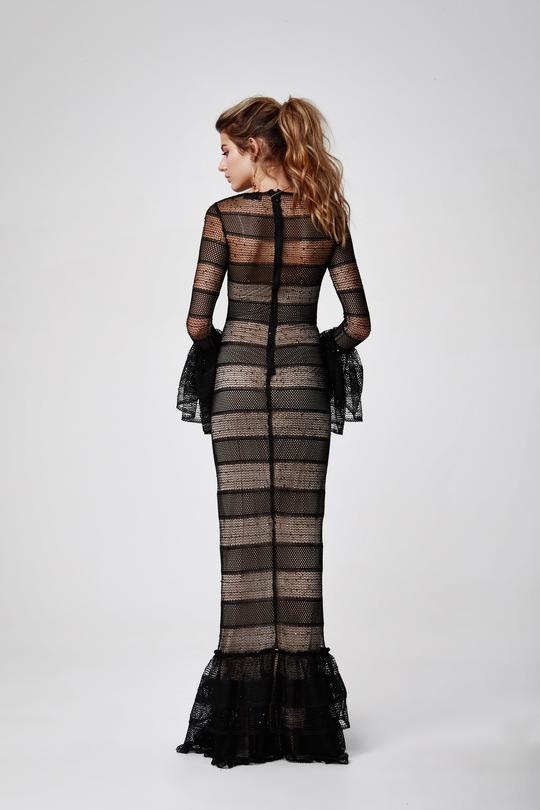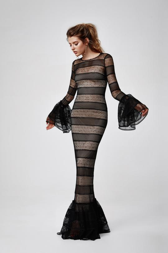 The Halima is a gorgeous full sleeve floor length gown which features two-layer ruffles at the sleeve and floor. The black Crochet fabric features horizontal lines and tiny sequins effect, lined with a georgette. Simply pair with some stilettos, and the Halima is perfect for a night out in the colder months which are upon us. Available in Black.