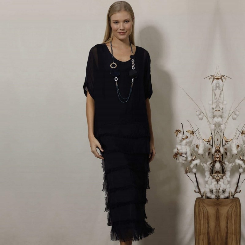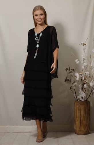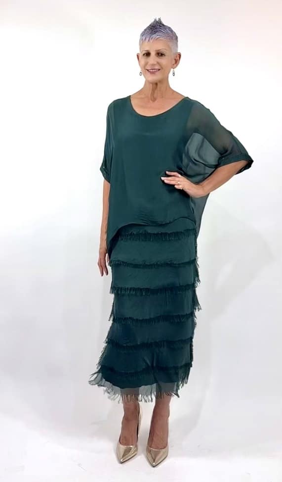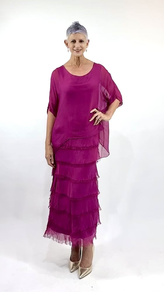 This Layered Silk Dress, which is a super flattering modern take on the flapper dress from the 1920s. Crafted from a super luxurious silk blend fabrication, this must-have dress features a ruffle layered skirt with raw edges, a comfy jersey underlay, scoop neckline and batwing sleeves. Sits midi length on most.