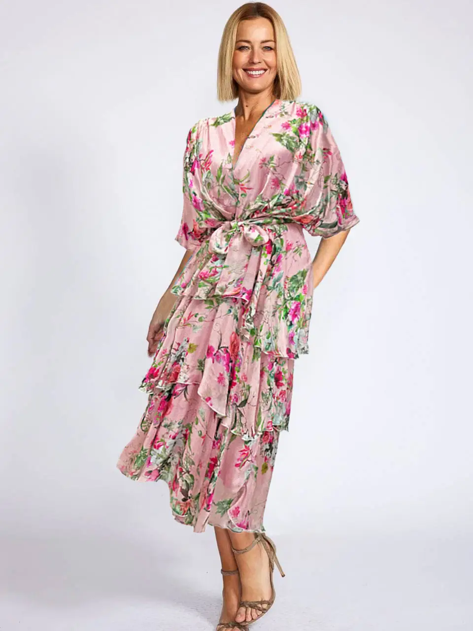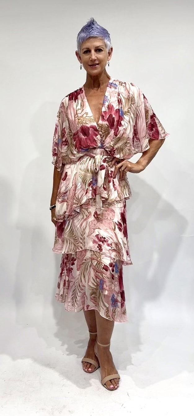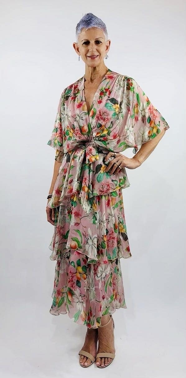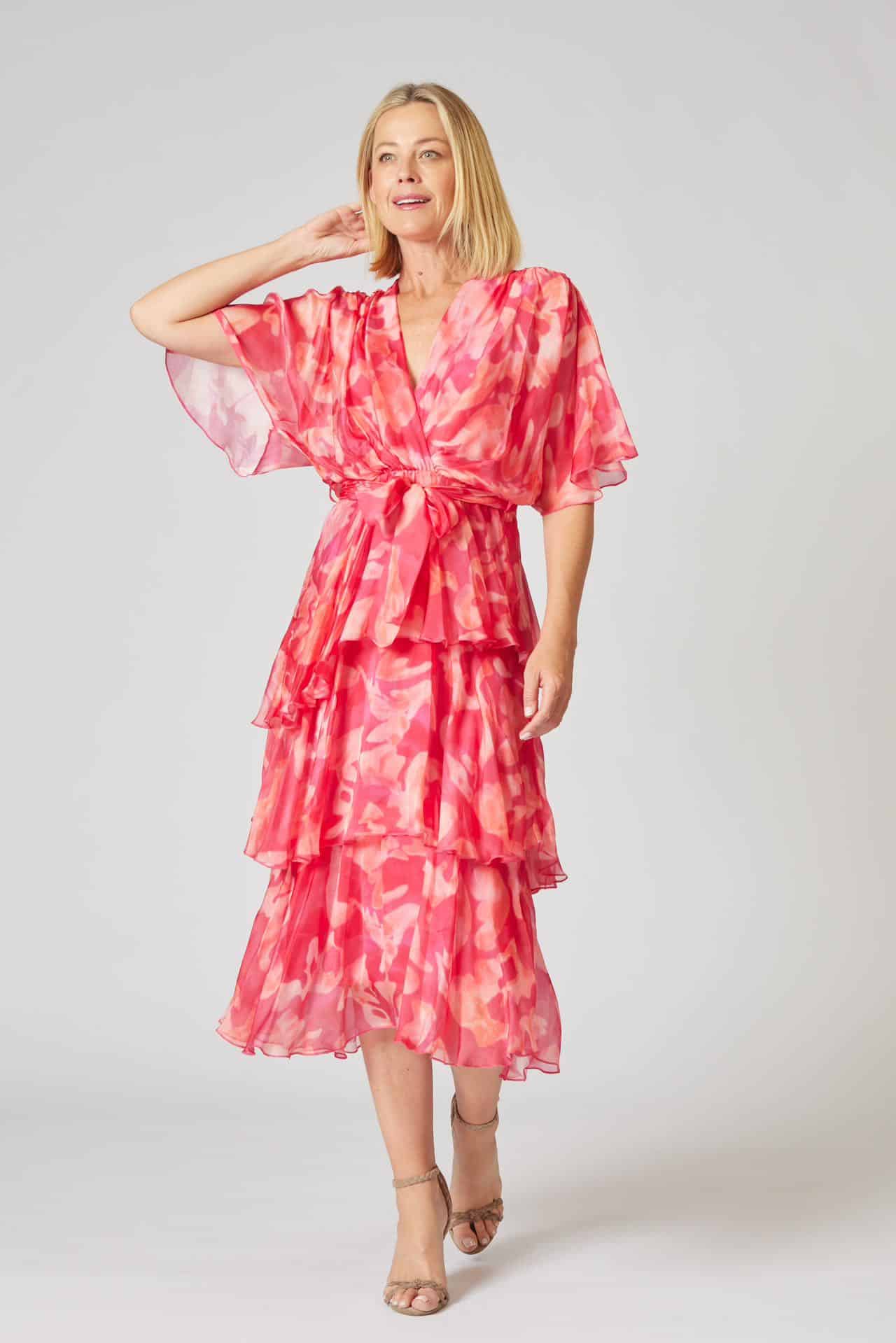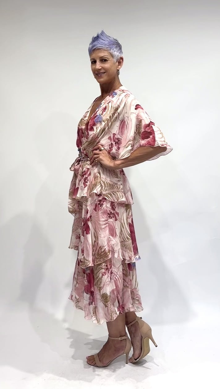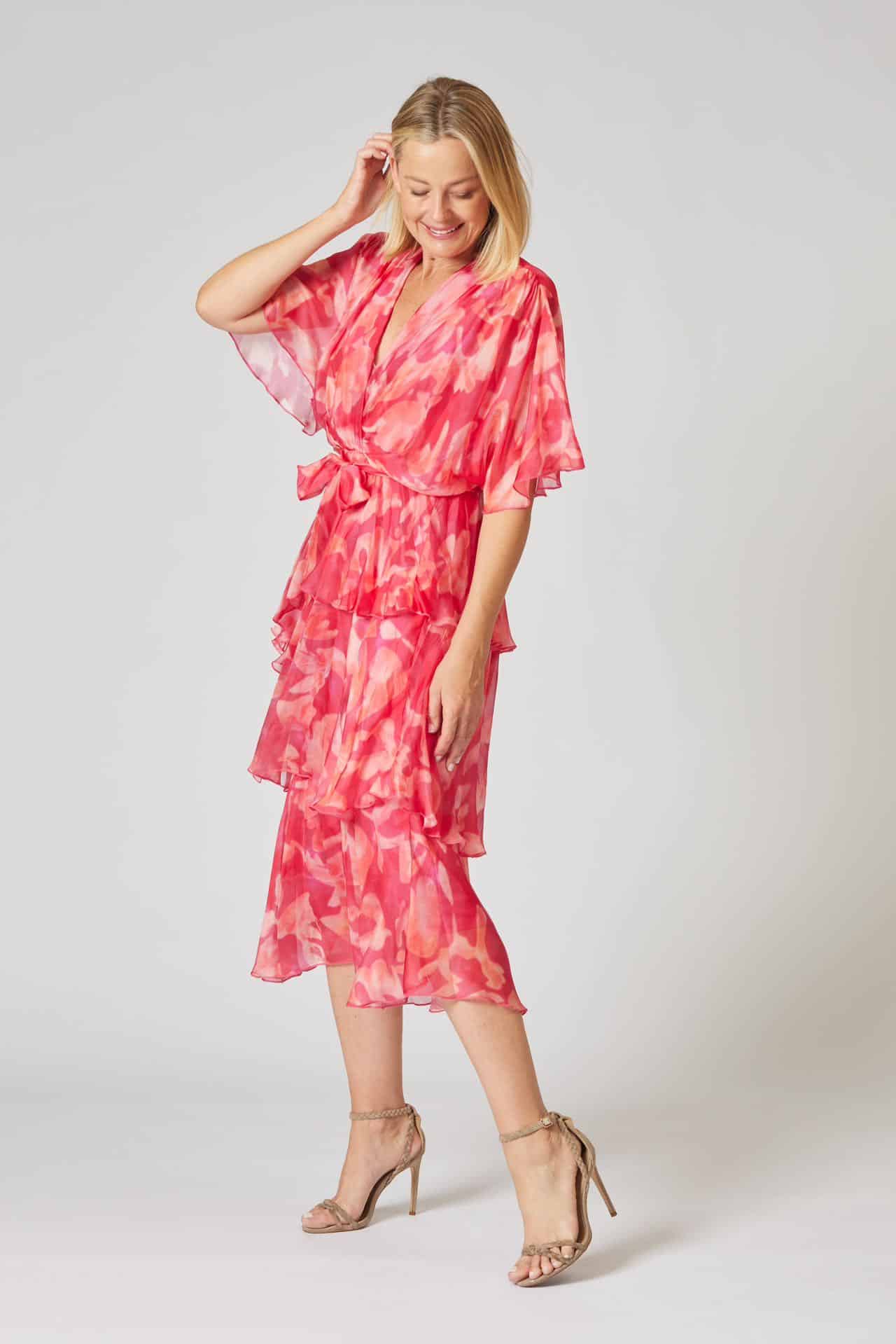 This Cross Over Silk Dress, with its super luxurious silhouette will no doubt be on high rotation in any wardrobe. Crafted from comfy silk blend fabric with a soft stretch jersey inner layer and featuring a eye-catching green base with hot pink floral print, short flutter style sleeves, cross-over v-neckline, wrap look bodice, fitted elastic waist with option tie belt, baby lock stitch detailing and asymmetric layered midi-length draping skirt will be the perfect option for any occasion.