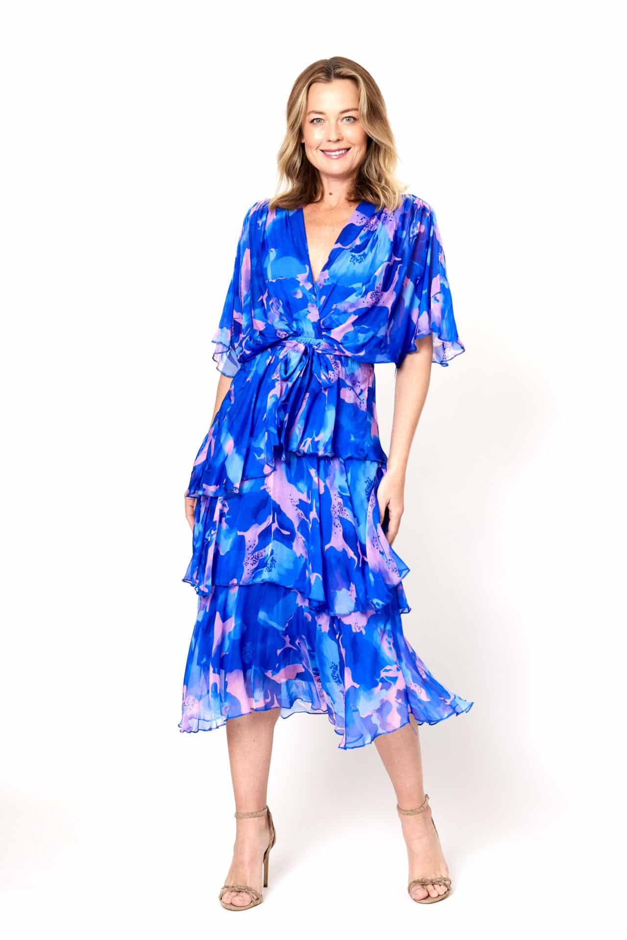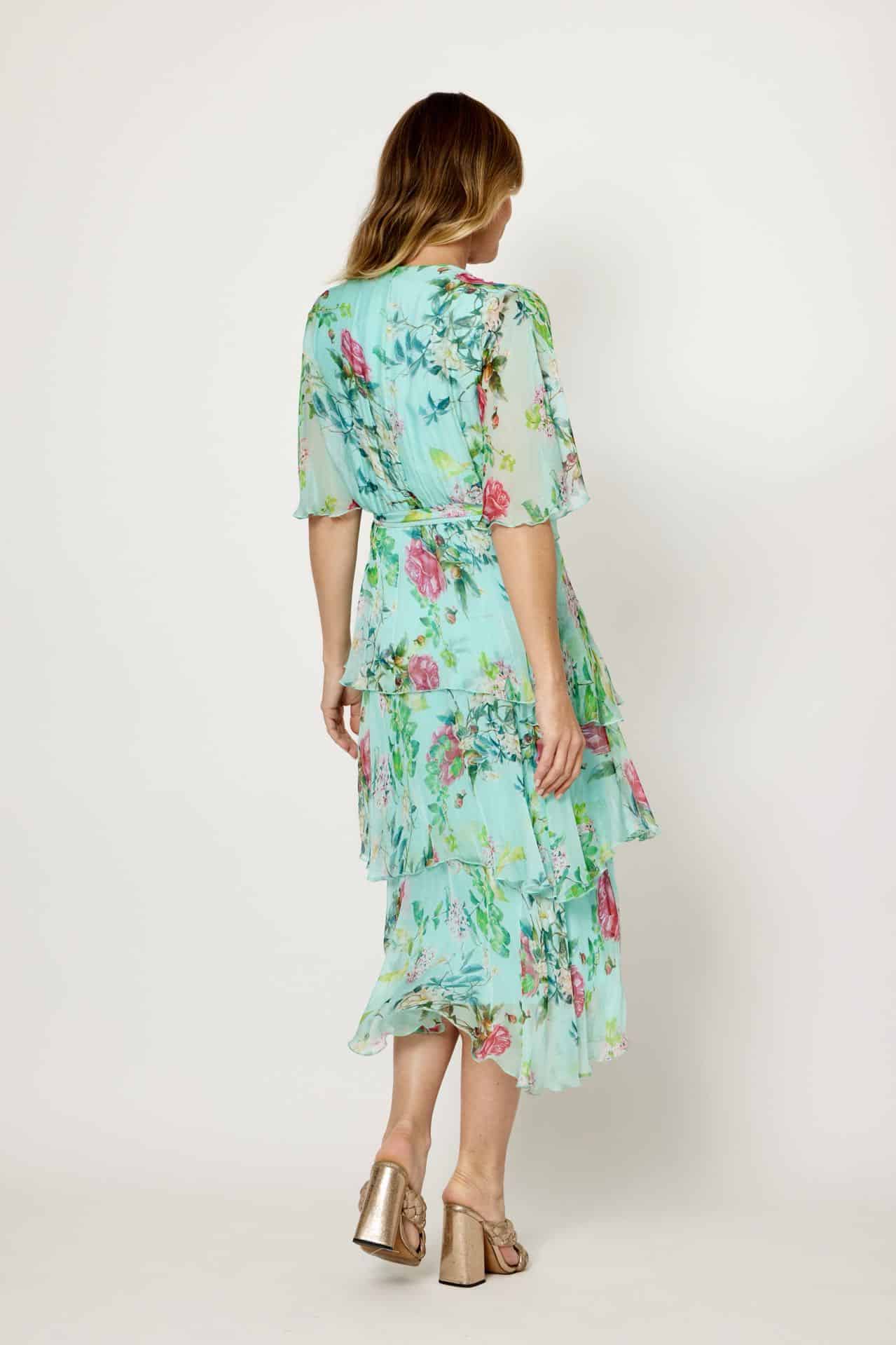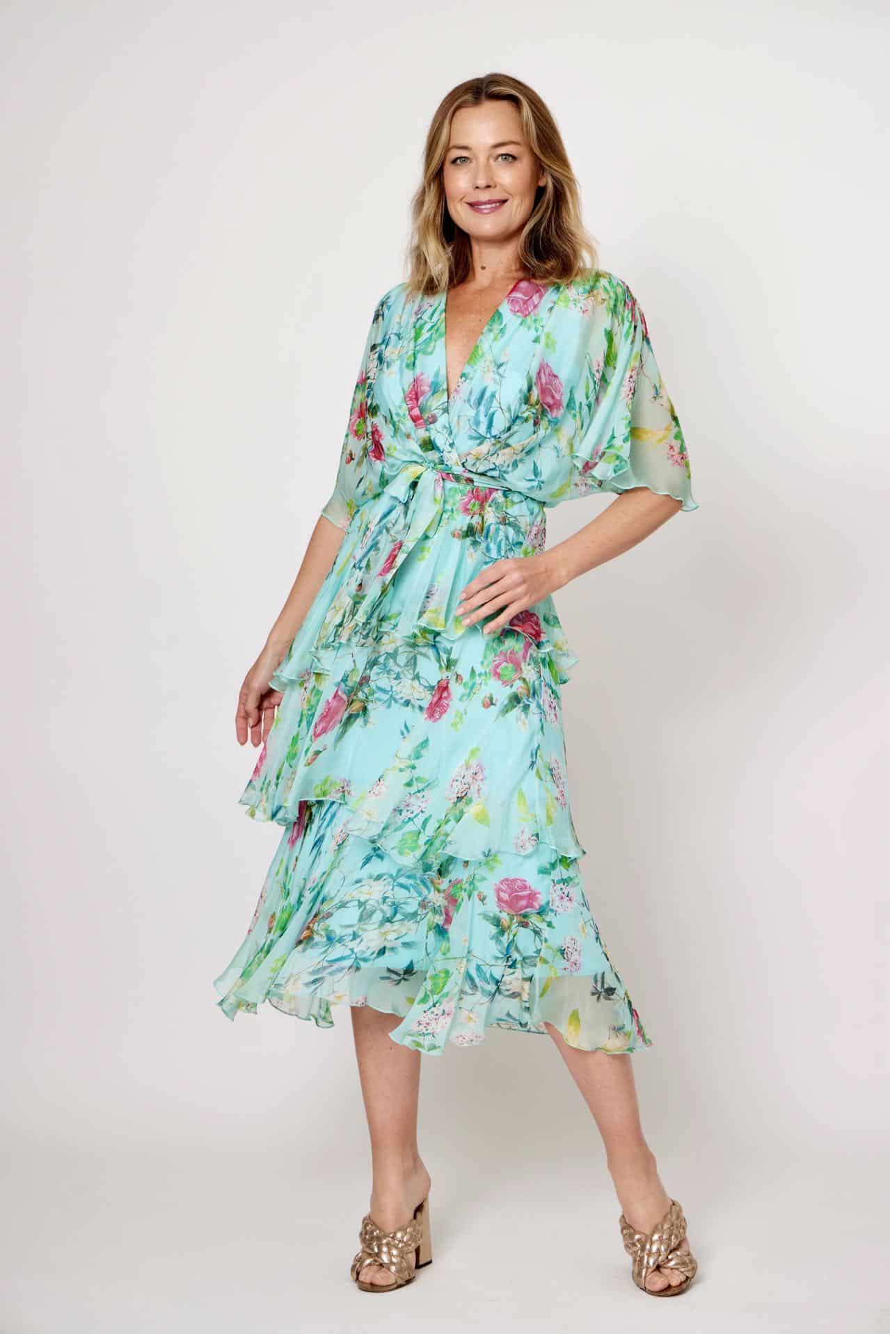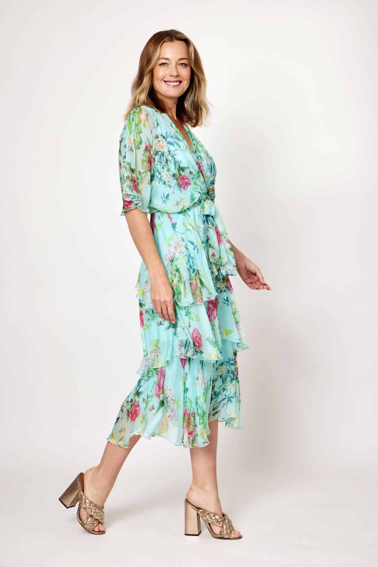 This Cross Over Silk Dress, with its super luxurious silhouette will no doubt be on high rotation in any wardrobe. Crafted from comfy silk blend fabric with a soft stretch jersey inner layer and featuring a eye-catching green base with hot pink floral print, short flutter style sleeves, cross-over v-neckline, wrap look bodice, fitted elastic waist with option tie belt, baby lock stitch detailing and asymmetric layered midi-length draping skirt will be the perfect option for any occasion.