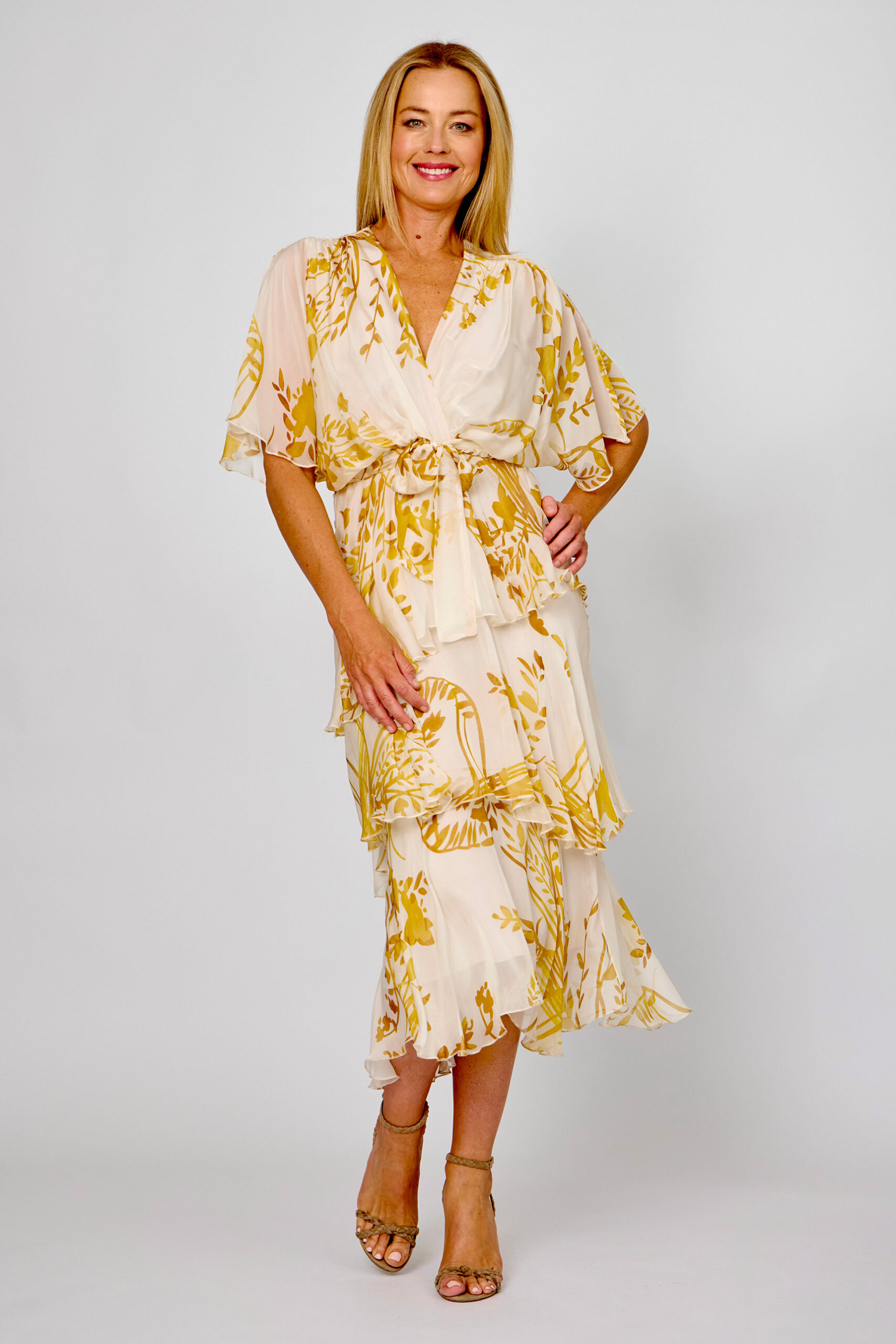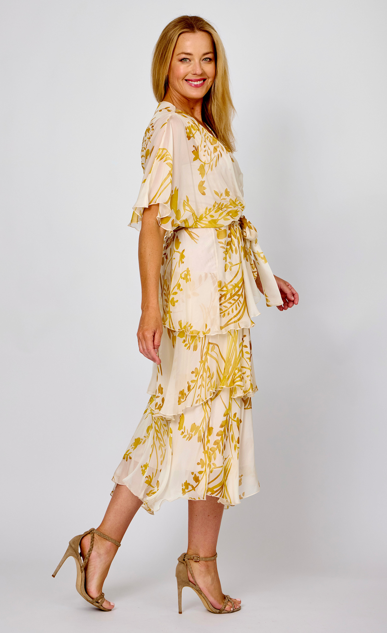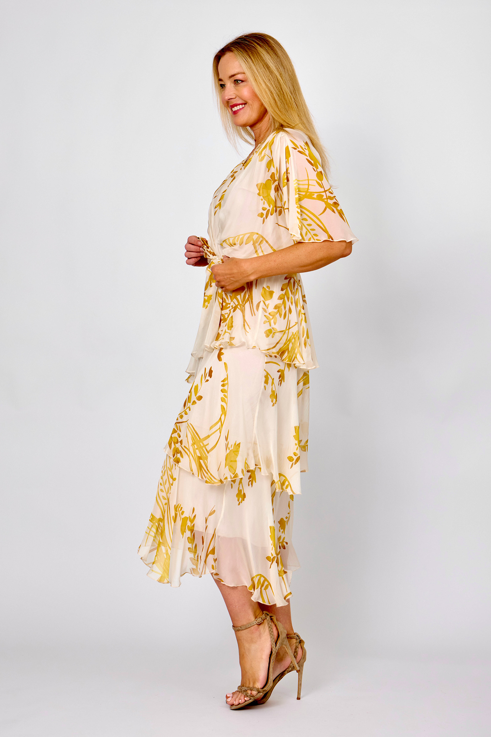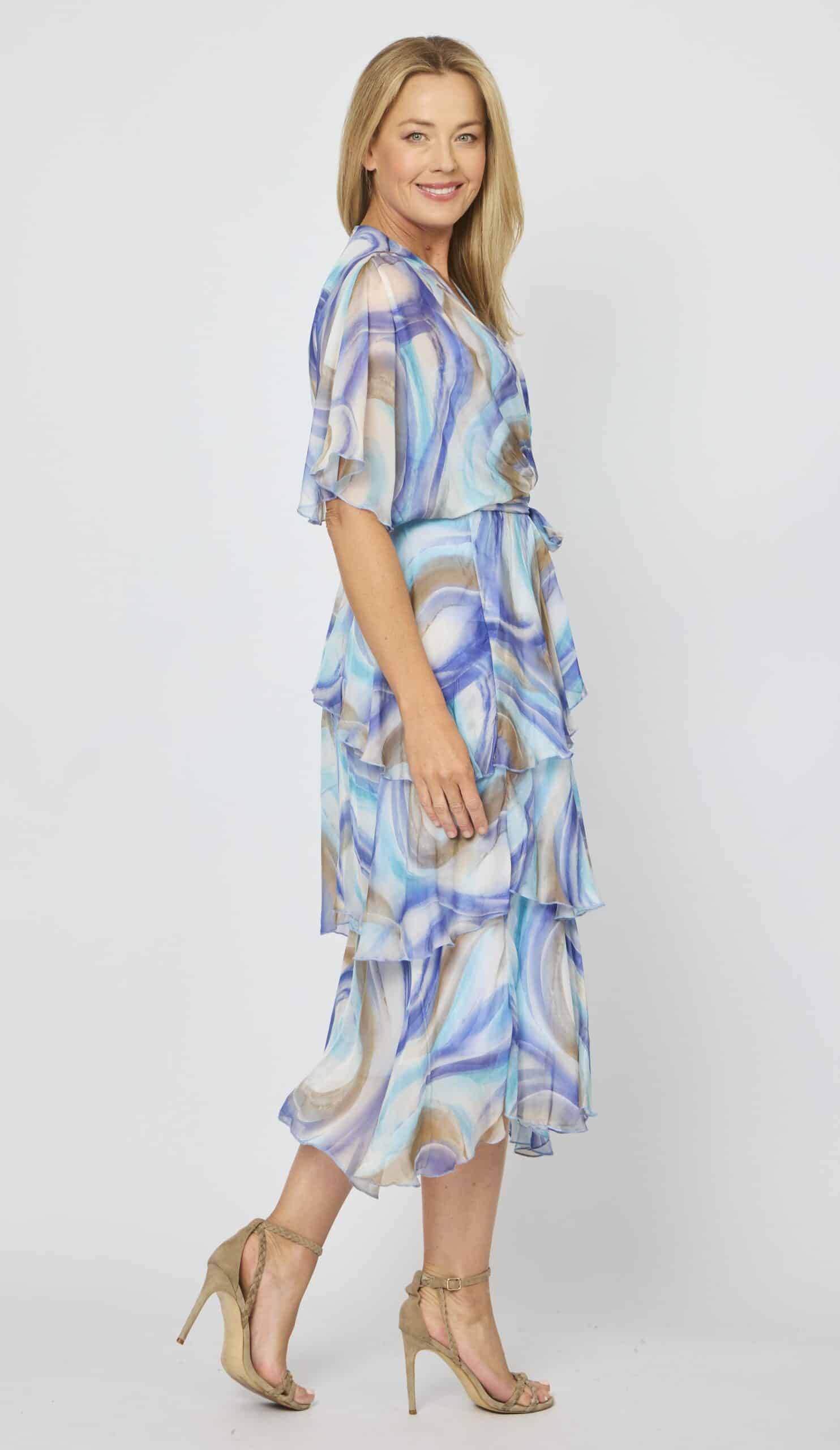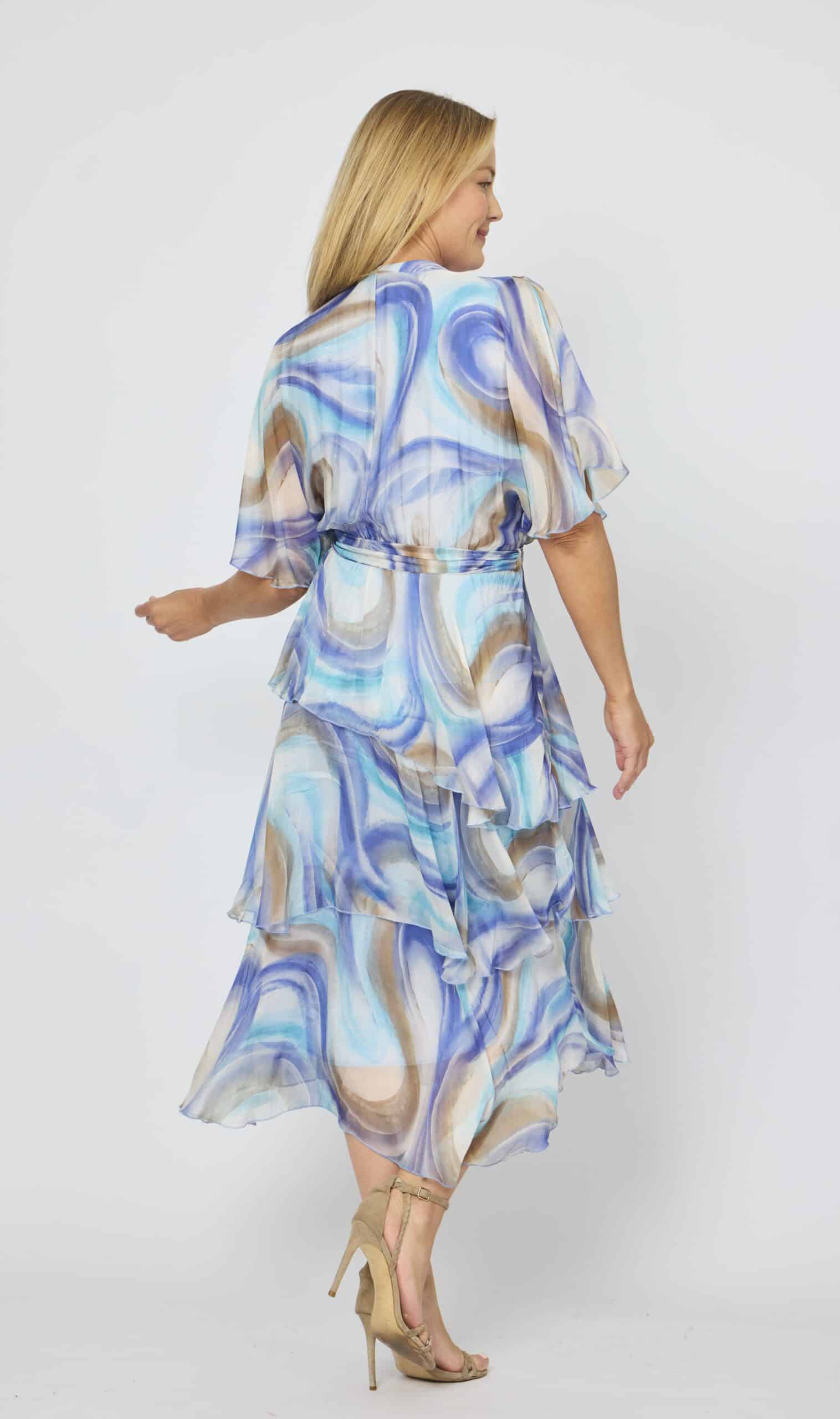 This Cross Over Silk Dress, with its super luxurious silhouette will no doubt be on high rotation in any wardrobe. Crafted from comfy silk blend fabric with a soft stretch jersey inner layer and featuring a eye-catching green base with hot pink floral print, short flutter style sleeves, cross-over v-neckline, wrap look bodice, fitted elastic waist with option tie belt, baby lock stitch detailing and asymmetric layered midi-length draping skirt will be the perfect option for any occasion.