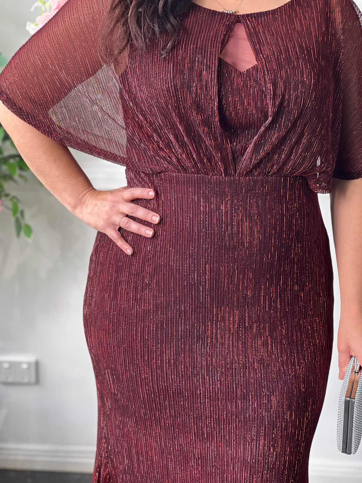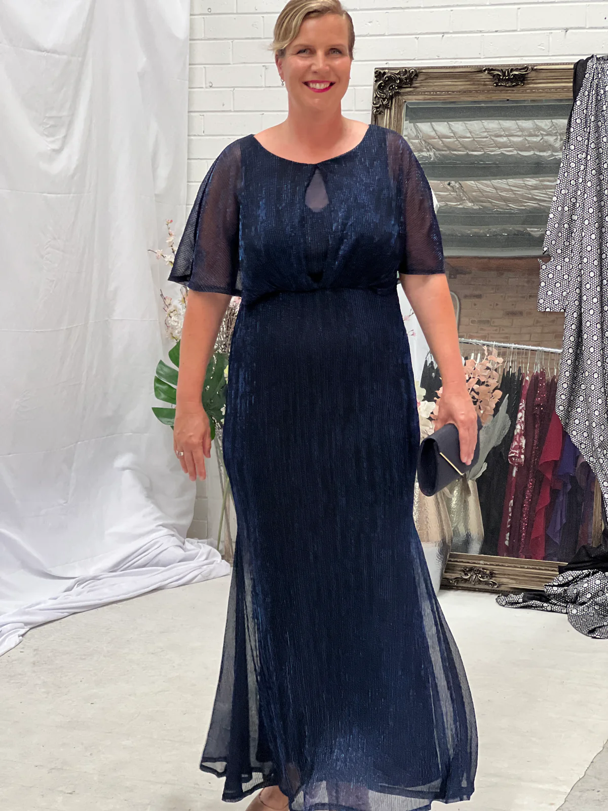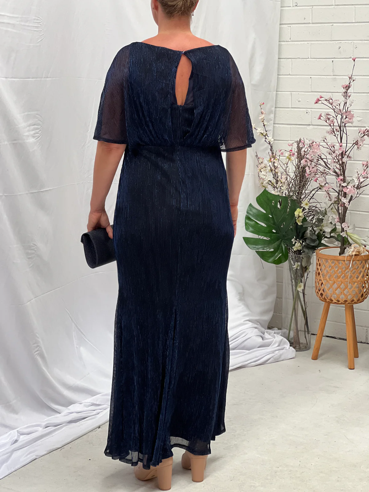 Turn heads in our stunning Evening Elegance Gown, available in rich Merlot and classic Navy. Crafted with a shimmering pleated fabric, this full-length gown features a soft cape overlay that drapes beautifully over the shoulders for an effortlessly flattering silhouette. The elegant design skims the body while allowing ease of movement, making it the perfect choice for formal events, black-tie occasions, and mother of the bride outfits.