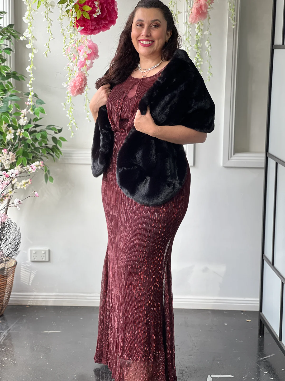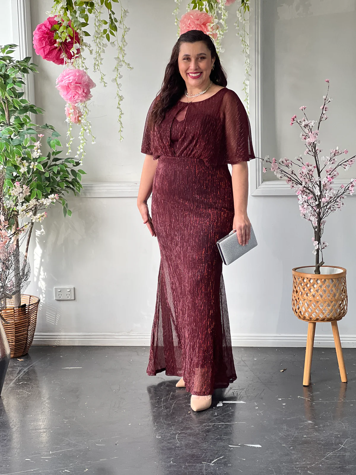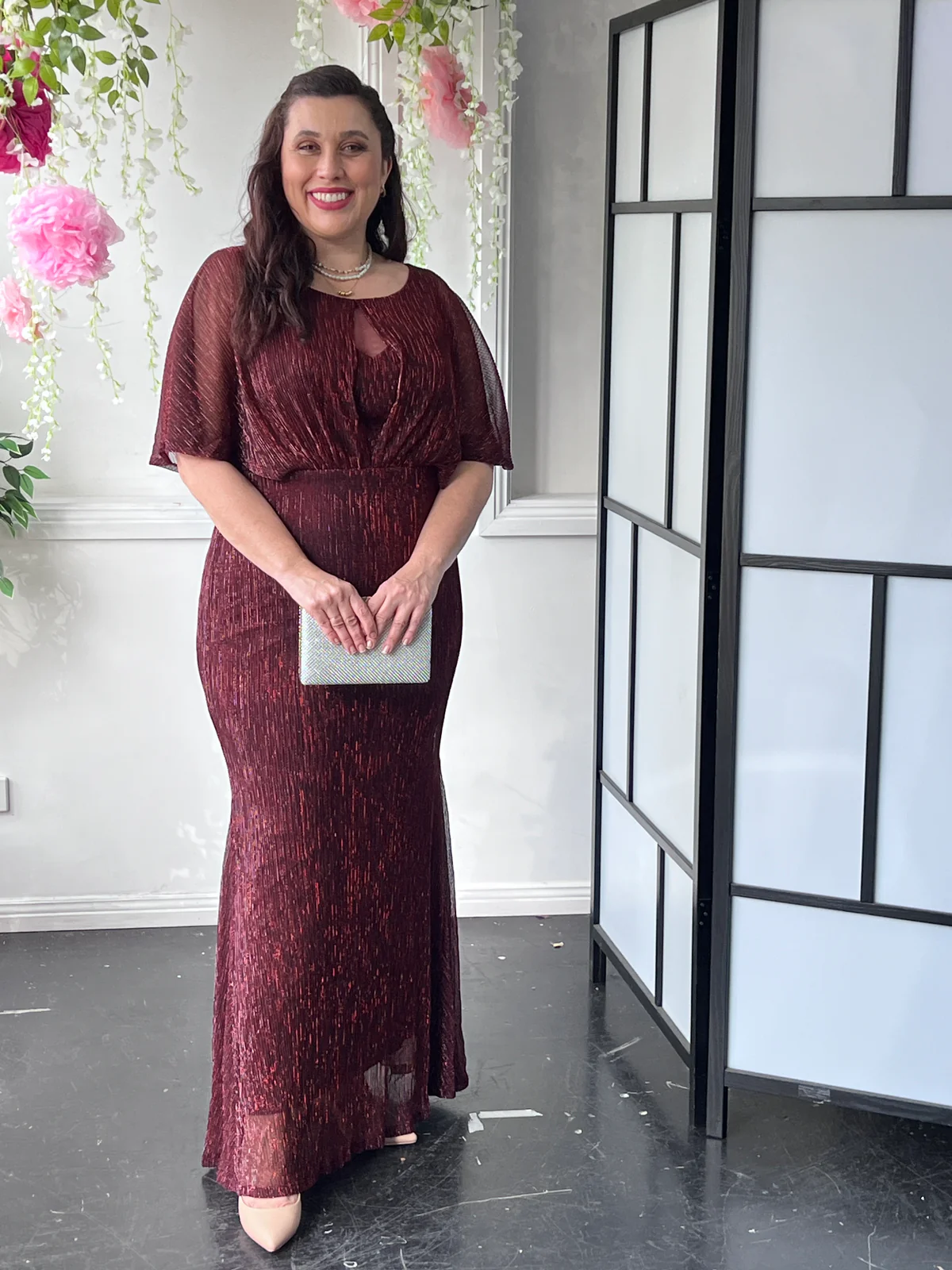 Turn heads in our stunning Evening Elegance Gown, available in rich Merlot and classic Navy. Crafted with a shimmering pleated fabric, this full-length gown features a soft cape overlay that drapes beautifully over the shoulders for an effortlessly flattering silhouette. The elegant design skims the body while allowing ease of movement, making it the perfect choice for formal events, black-tie occasions, and mother of the bride outfits.