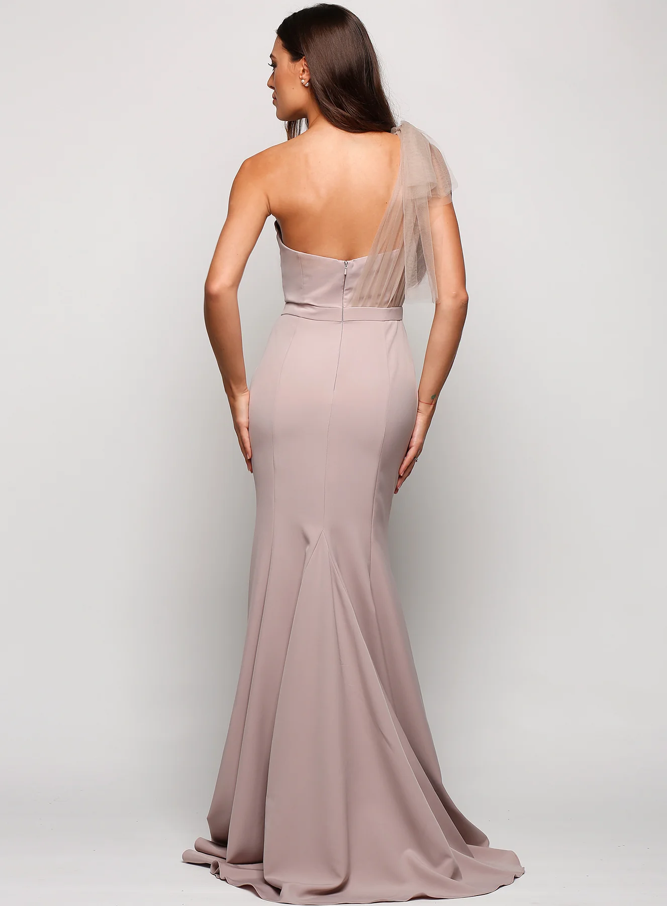 Modern glamour meets effortless elegance in the Marissa Dress by Samantha Rose. This stunning one-shoulder gown features a delicately pleated mesh overlay across the bodice, offering a soft, ethereal touch to its sleek and structured silhouette.