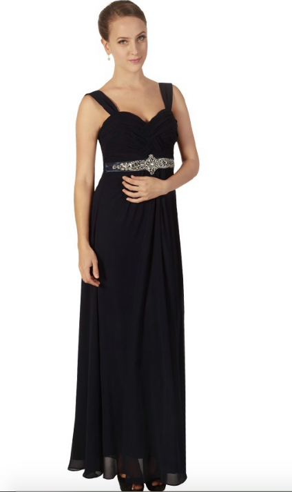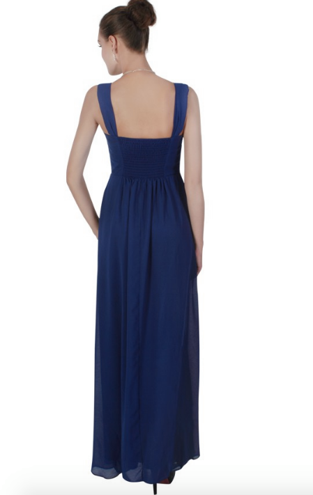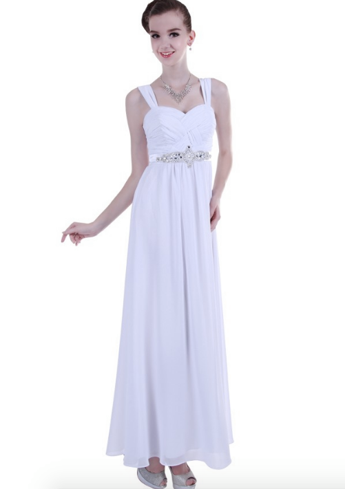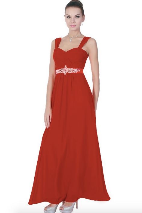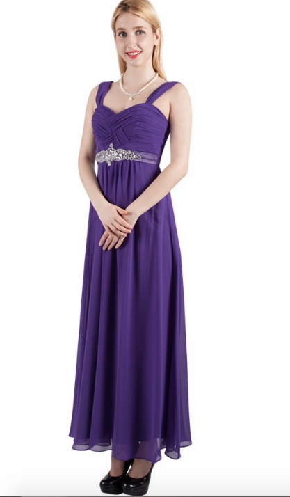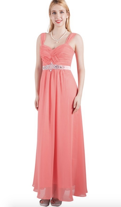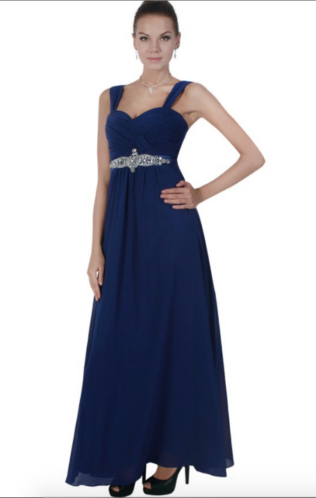 This dress is a popular style as it suits all body shapes and looks great whether you are a size 8 or 26. It is a full length chiffon gown which features beautiful beading and crystals on the satin band below the bodice, perfect for any formal occasion. This style comes as a standard with a shirring back but can be made with a zipper back as a special order.