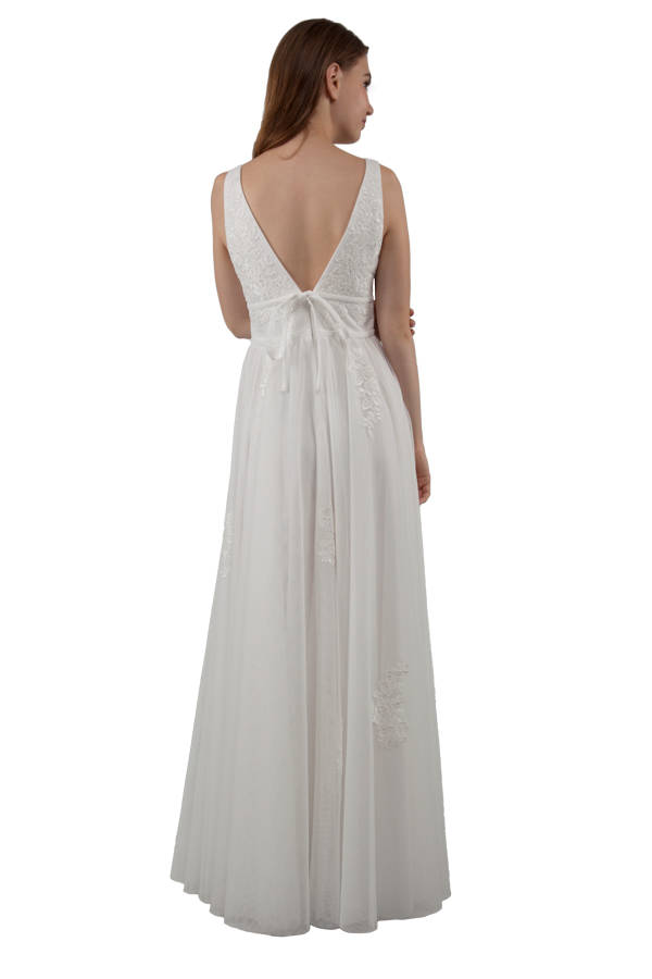 This A line gown with its Simple Lace and Tulle overlay is a classic style