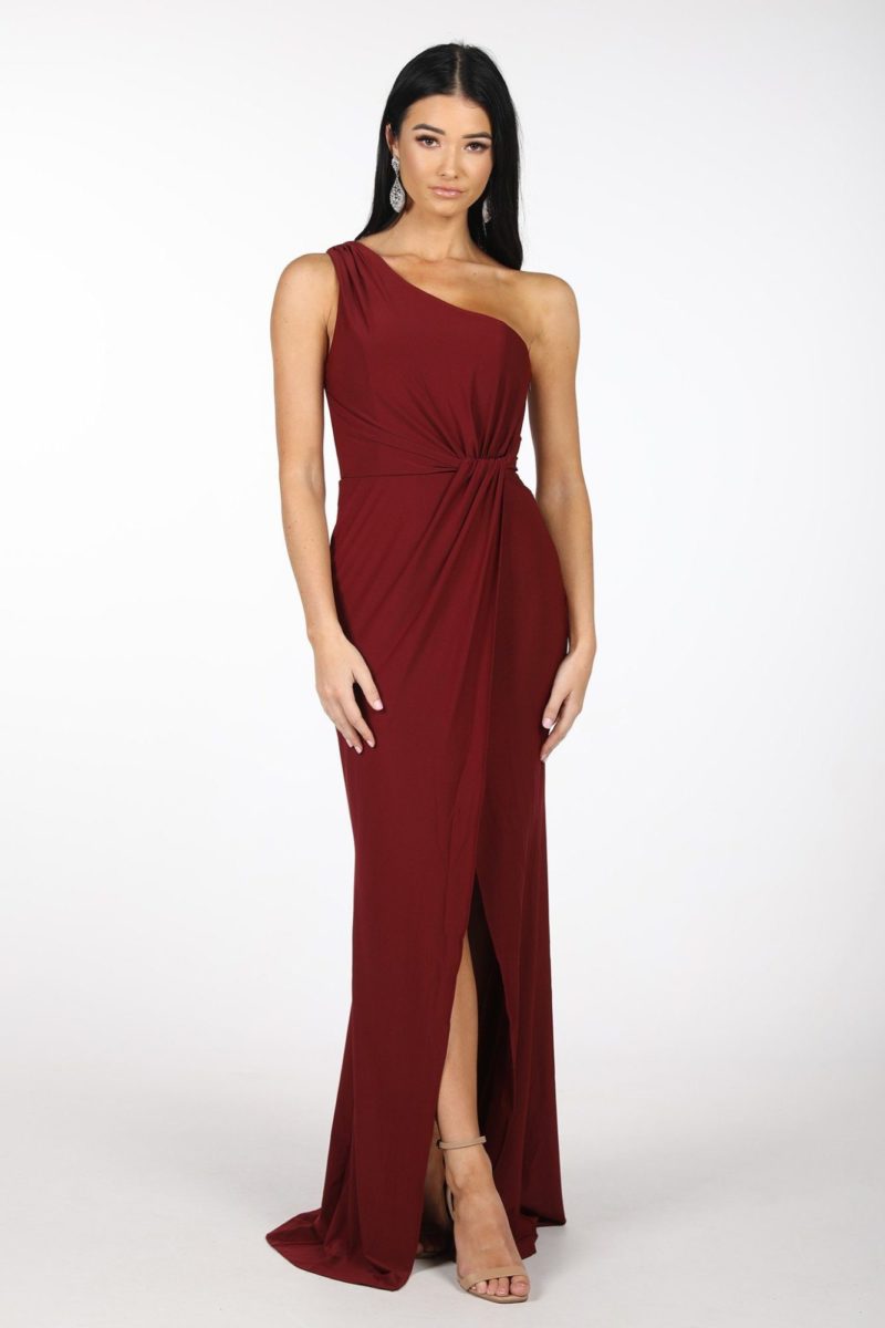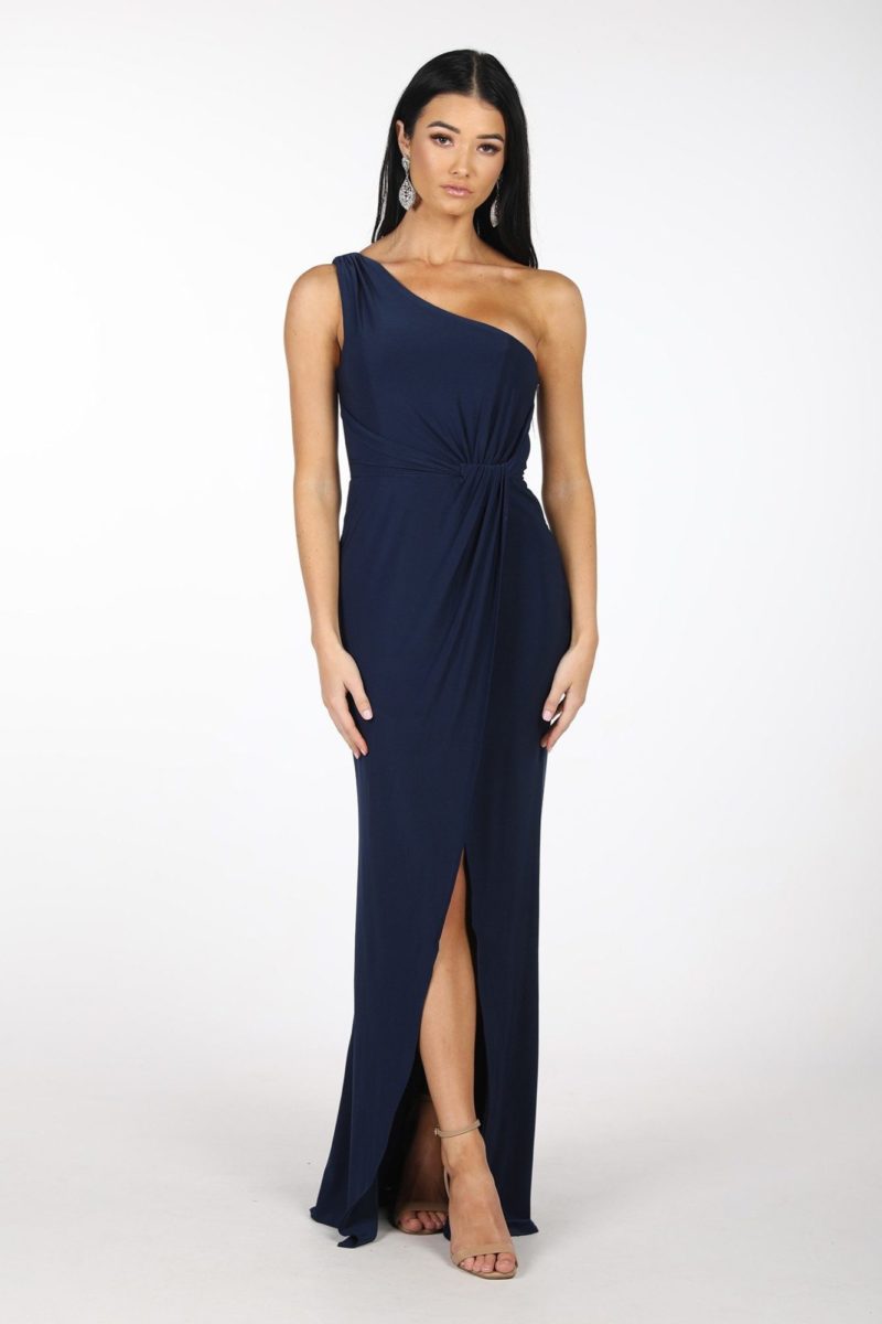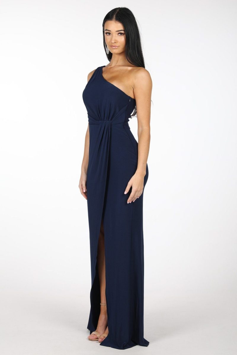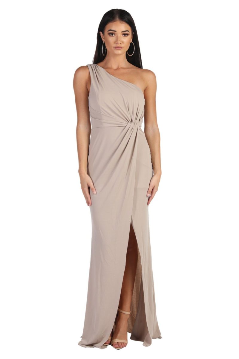 219495 One shoulder Grecian style gown with gathering and a cross over slit going through the centre front, made in a thin jersey fabric with jersey lining and an invisible zipper at the left side seam.