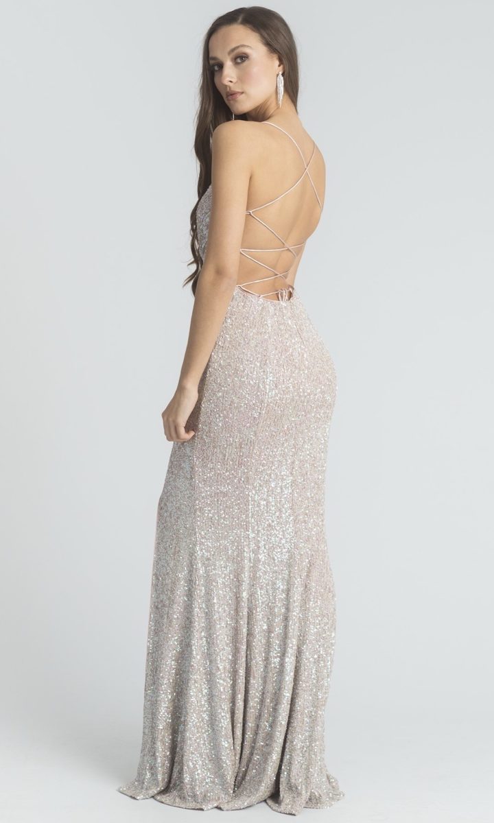 With its iridescent sequins this gown will make you shine. It has a beautiful strappy back, low V front and a split leg. IT has been a winner and now ONLY one left