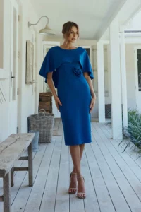 The Susannah dress is tailored for the sophisticated mother of the bride. Crafted from stretch scuba fabric, it offers both comfort and elegance. The high neckline and exquisite cape detail exude sophistication, while a detachable rosette brooch adds versatility. The fitted mid-length skirt accentuates curves with grace, complemented by a back skirt kick pleat for ease of movement. With inner bra cups and a fully lined stretch interlining, this dress prioritises comfort and confidence, ensuring you shine with poise on your daughter’s special day.