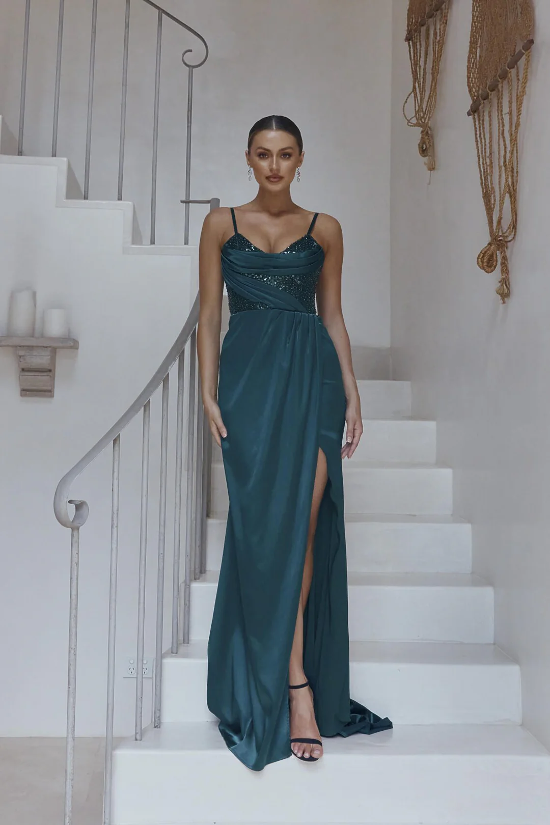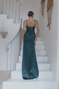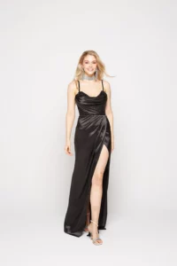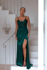 Introducing the Ella dress, designed to steal the spotlight at any formal event. The sheer sequin V front bodice adds glamour, while flat straps bring a modern touch. Satin pleated drape detail exudes elegance. The fitted skirt accentuates curves, with a pleated overlap split for playfulness. Unique back upper skirt ruching sets this dress apart. Comfort features include inner bra cups and a fully boned bodice. Fully lined for luxurious feel, with a back invisible zipper closure for seamless wear. Embrace your individual style, feel confident, and own the spotlight in the Ella dress.