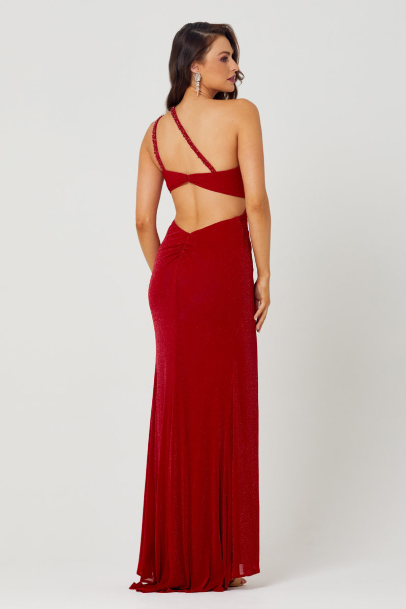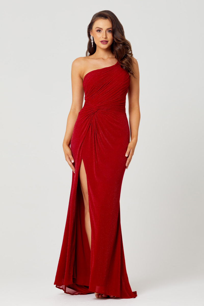 The Matilda One Shoulder Evening Dress PO884 by Tania Olsen Designs is a beautiful design and perfect for your next formal or evening occasion. It features a striking one shoulder, gathering through the bodice which leads to a knot detail and a high leg split. The open back with cut out detailing is held together by the crystal embellished spaghetti straps. These straps sit on either side of the back strap to create ample support. The Matilda is made from a luxurious sparkle stretch knit material which creates a streamlined silhouette and hugs the body beautifully. Sizes AU 4-30, Sparkle Stretch Knit, Fully Lined, Floor Length, Evening Dress.