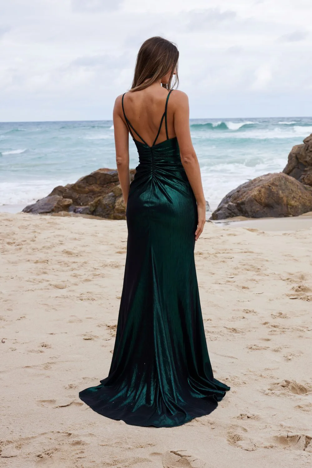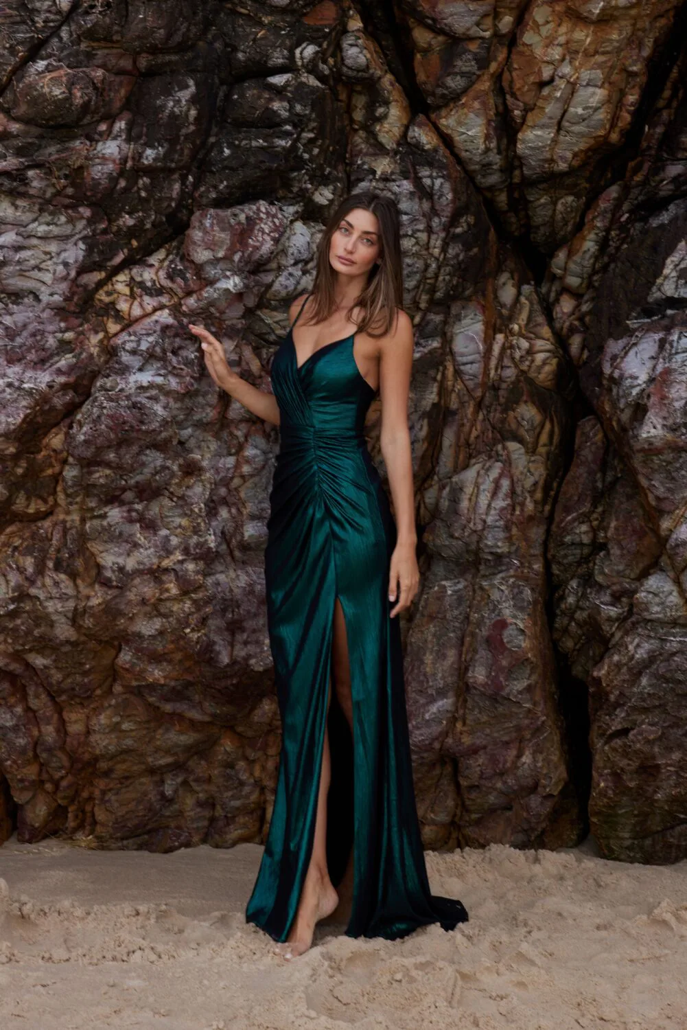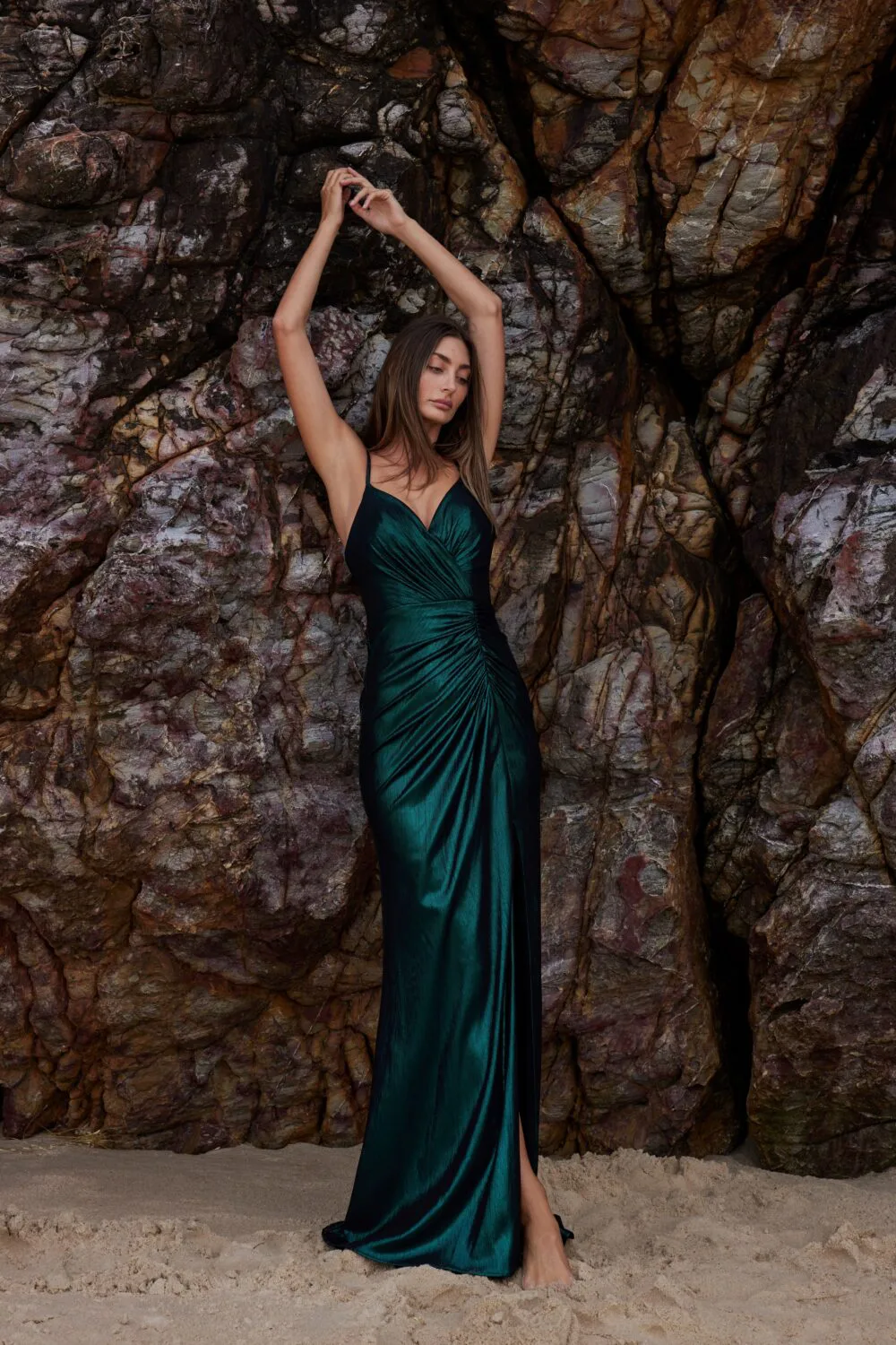 Dress to impress in the Lani PO956 by Tania Olsen Designs. She features a classic v neckline with crossover detail and thin spaghetti straps that attach to a mid v back. From the waistline falls a floor length skirt with leg split and train which adds the perfect glam touch. The Lani is available in Emerald