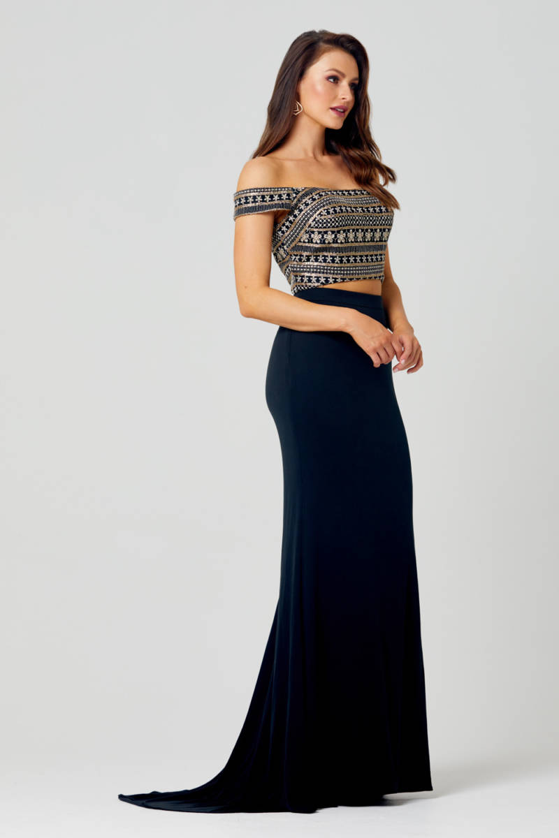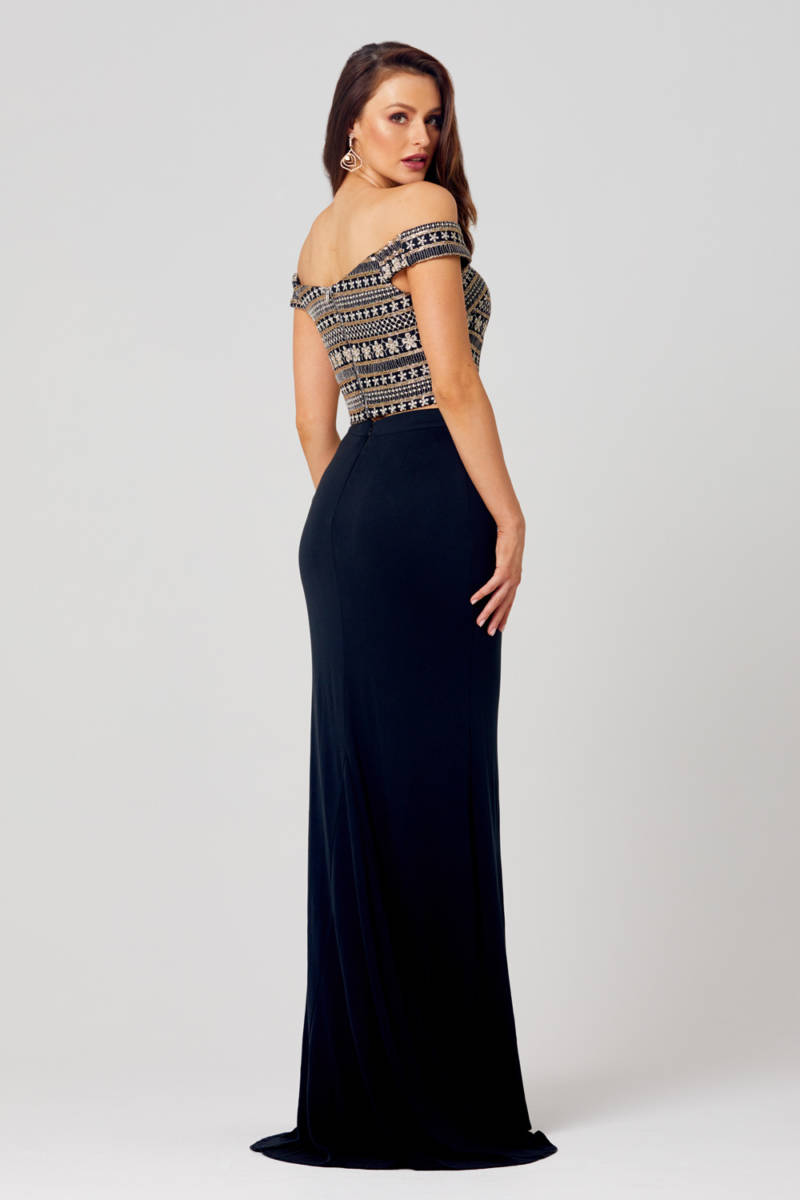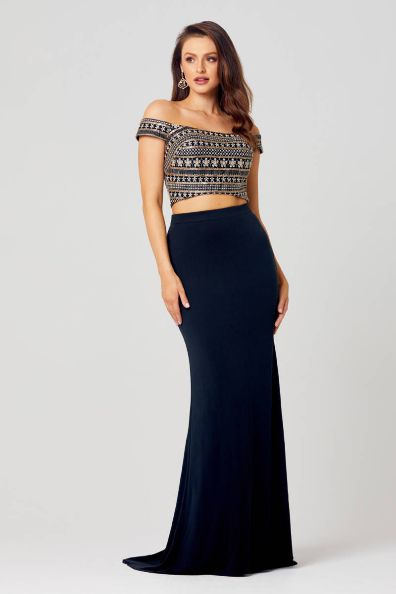 The Ana Embroidered Two-Piece Dress is a two piece set that comes with a stunning off shoulder embroidery sequin crop and fitted floor length skirt and train. The floor length skirt is fabricated with a luxurious knit material which compliments the mermaid silhouette perfectly. The Ana is perfect for high school formals, evening wear and those who want to stand out in a crowd. Accessorise it with minimalist gold jewellery, a neutral lip and heels. Available in store.