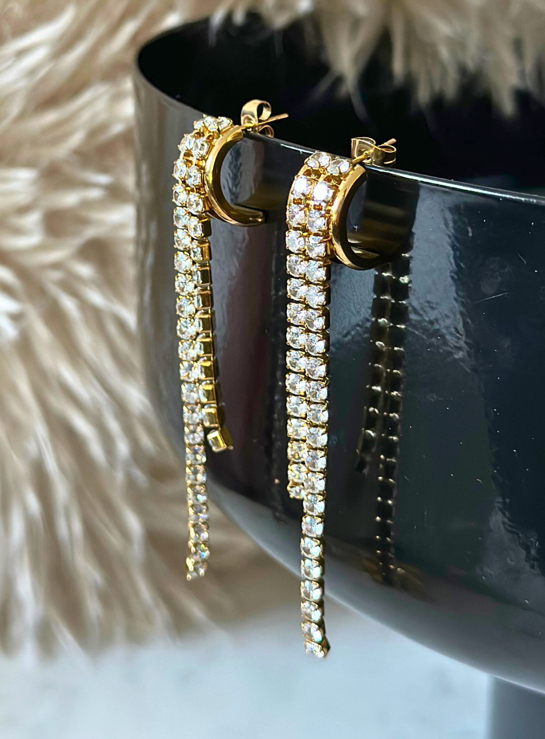 Dazzle in the Samantha Rose Ria Earrings, featuring a luxe gold-tone hoop with cascading rows of shimmering cubic zirconia. These drop earrings are designed to catch the light with every movement, adding effortless glamour to evening looks or special occasions. Bold yet refined, the Ria Earrings are your go-to for standout sparkle.