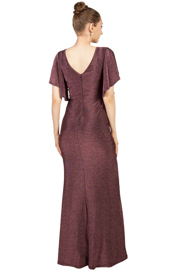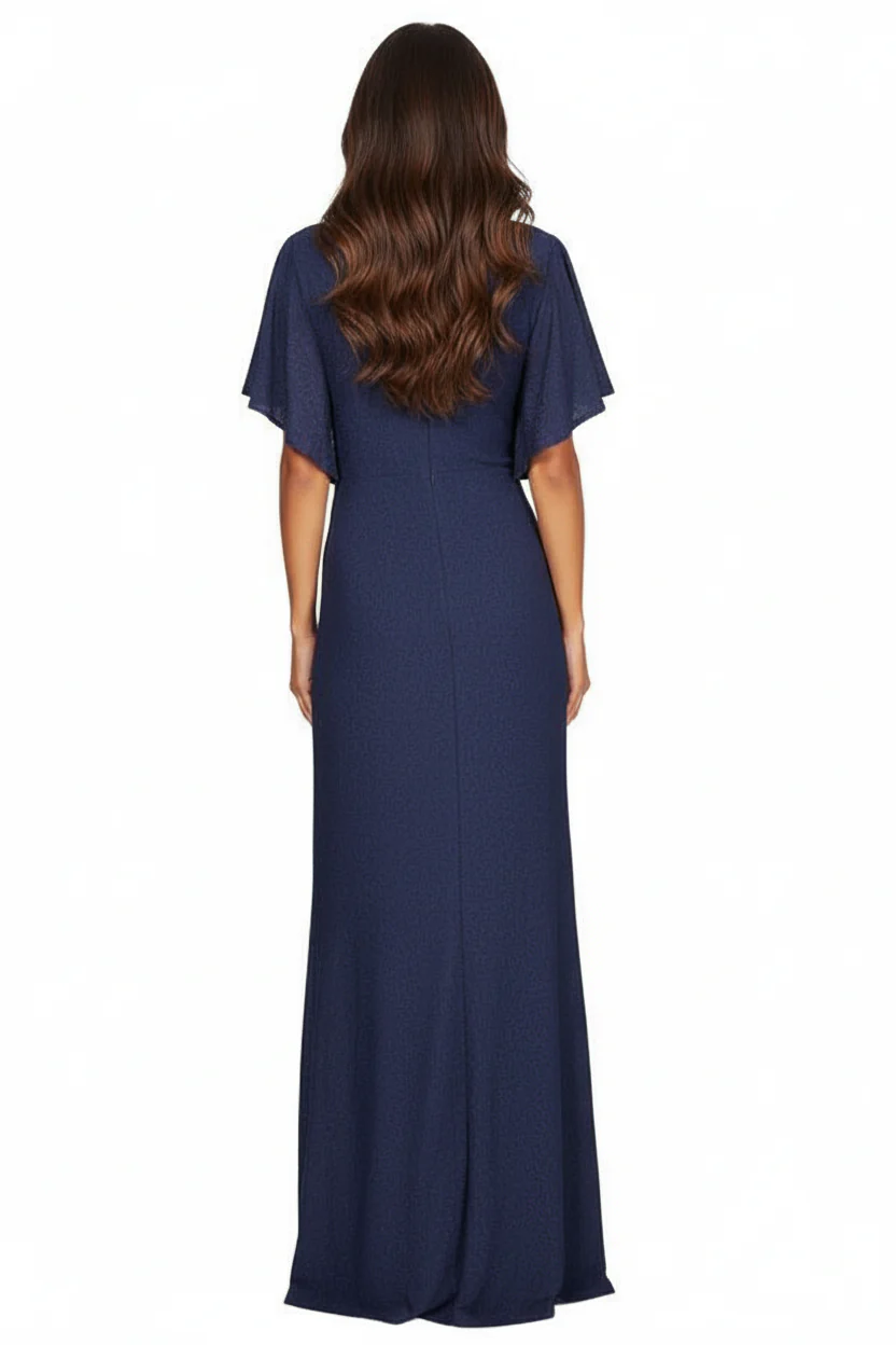 Crafted in a soft shimmer fabric, this gown features a classic round neckline and elegant flutter sleeves that provide graceful arm coverage. Gentle ruching through the waist enhances the natural shape without clinging, while the full-length skirt with a front split adds movement and a refined touch of drama.