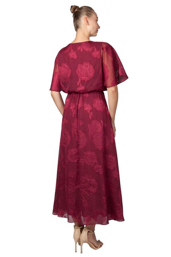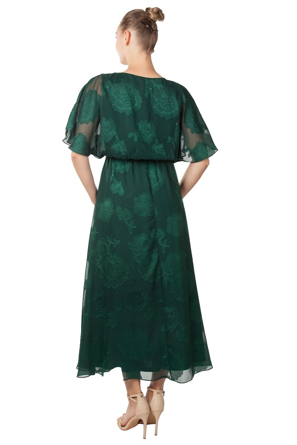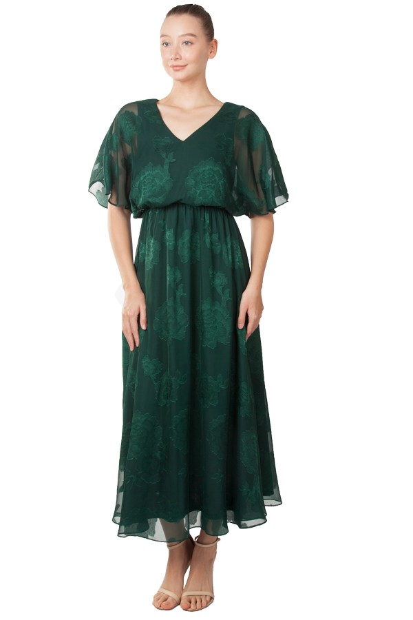 Crafted in lightweight floral chiffon, the relaxed overlay bodice drapes softly over the upper body, while the flutter sleeves provide flattering arm coverage. A gently elasticated waist creates shape without restriction, flowing into a soft midi-length skirt that skims over the hips and tummy area for a smooth, flattering silhouette.