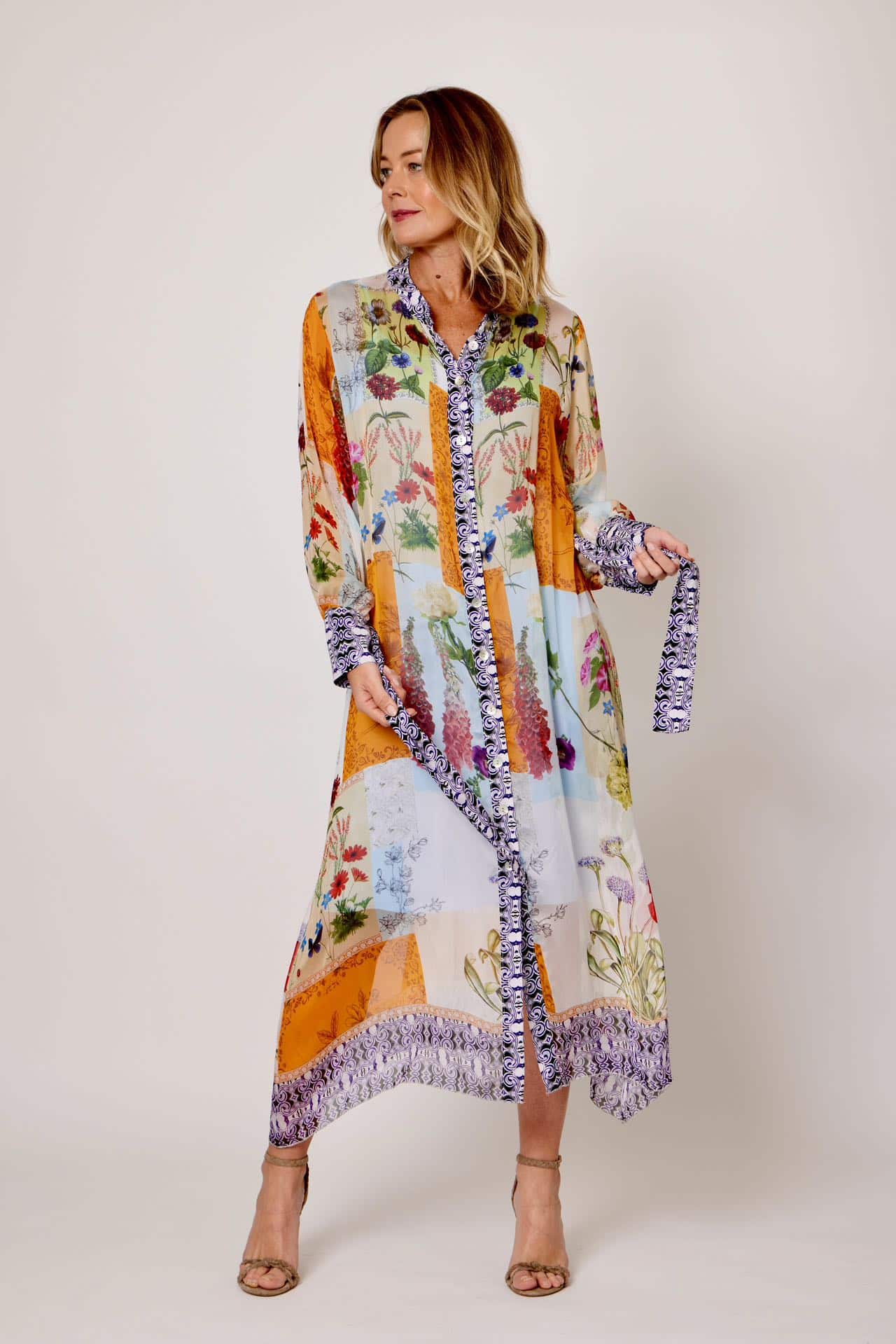 The Silk Shirt Dress, a gorgeous work of art perfect for dressing up or down to suit your occasion. Featuring a cool and comfortable silk blend fabrication, this easy-to-wear stunning style features a relaxed silhouette, long sleeves with cuff detailing, mandarin collar design, packet with button through front, midi length finish on most, baby lock stitched hems, slight asymmetric hem, belt loops with optional adjustable waist tie and a soft, stretch jersey long pale blue camisole underneath.