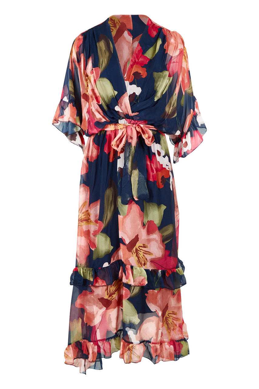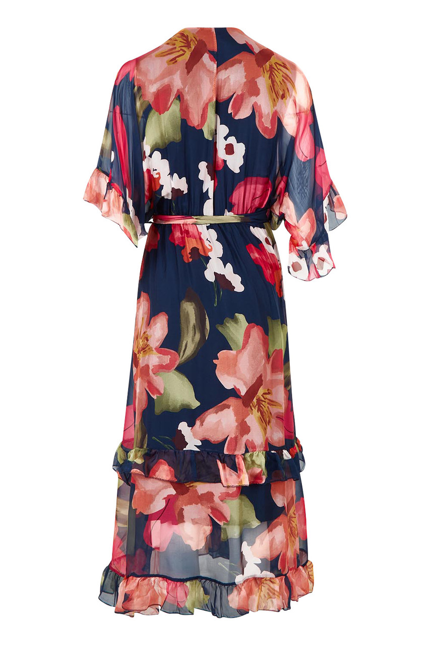 Featuring a flattering V-neckline, soft flowing sleeves, and a defined waist with self-tie detail, this dress enhances the silhouette without feeling restrictive. The romantic navy base with bold floral print makes it perfect for weddings, race days, garden parties, or evening events.