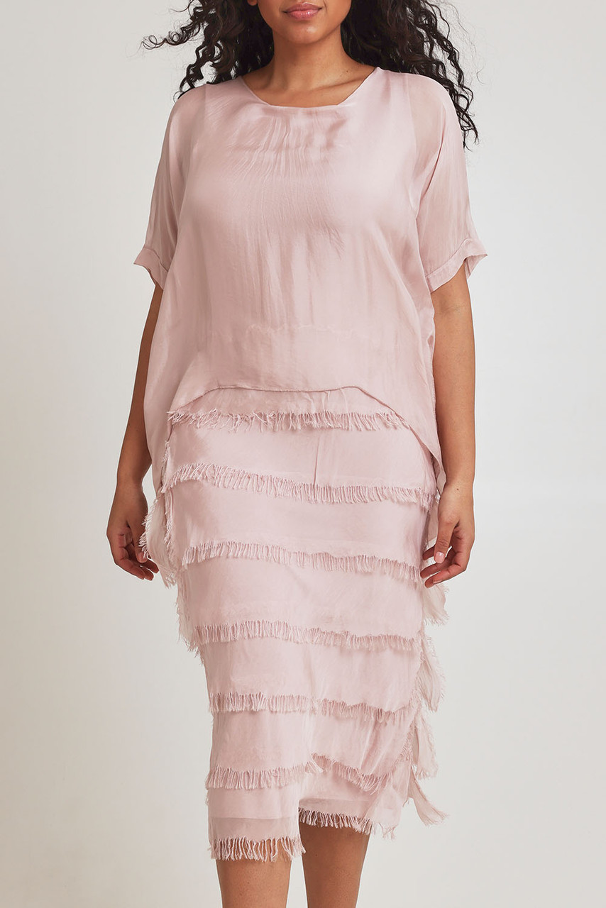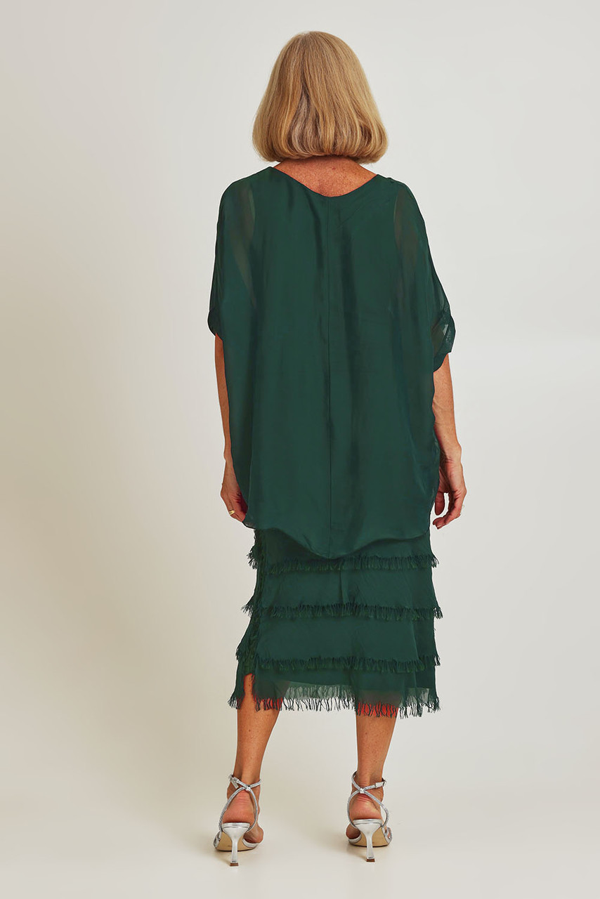 - Raw edge finish on tiers – different depth to fringe on each garment
