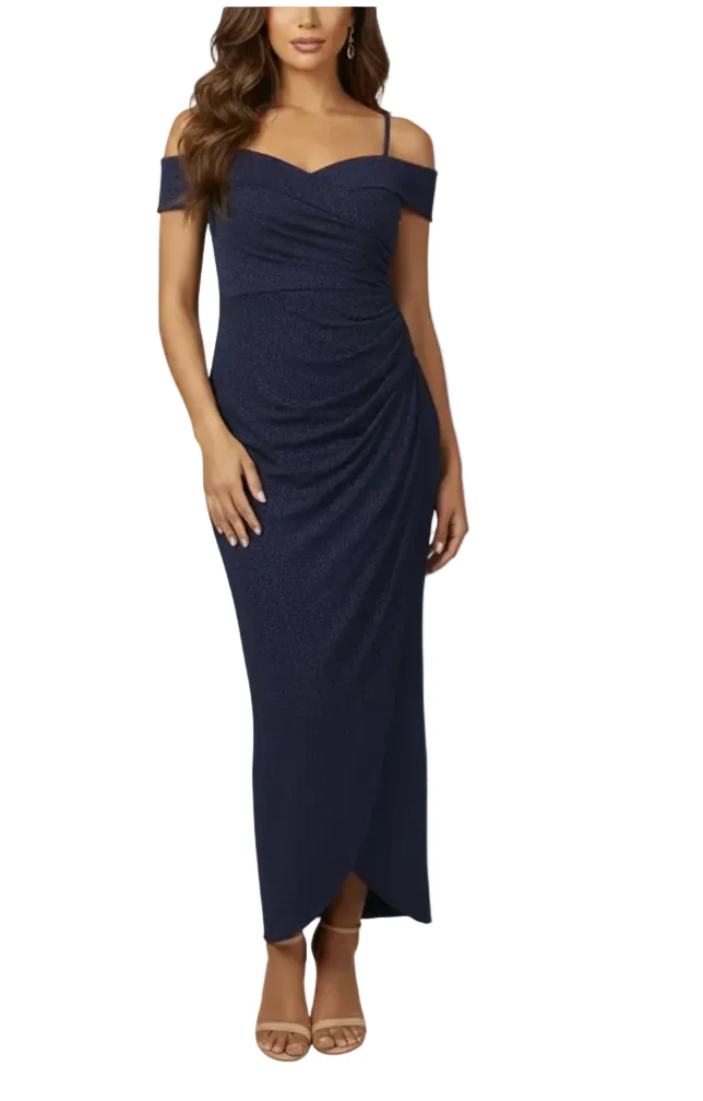The beautifully gathered waist enhances your natural curves, while the subtle shimmer stretch fabric provides comfort and a smooth, figure-skimming fit. The wrap-style skirt adds movement and elegance, making this dress a standout choice for weddings, formal events, and special occasions.