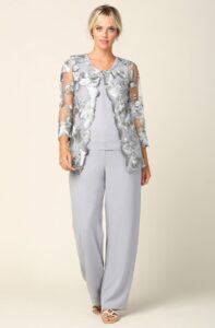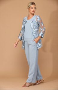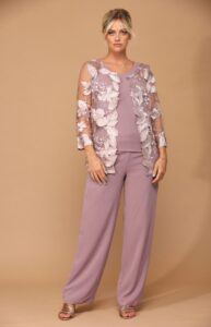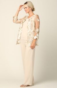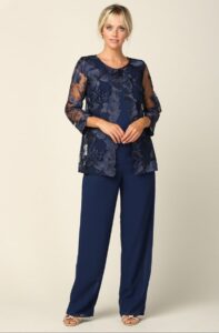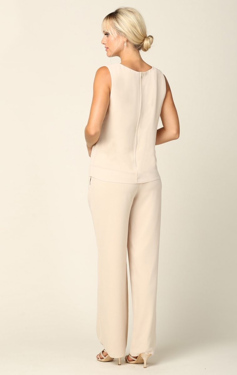 3-piece pebble georgette pant set with matching tank top and lace jacket. Pants have pockets and elastic waist, fully lined. Tank top is fully lined and has back zip for easy wear. Jacket has 3/4 sleeves and hook and eye closure at nape.
