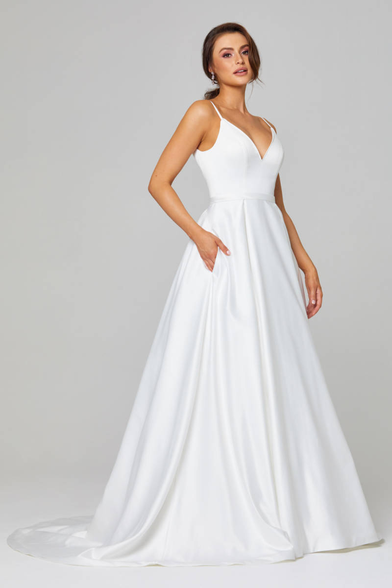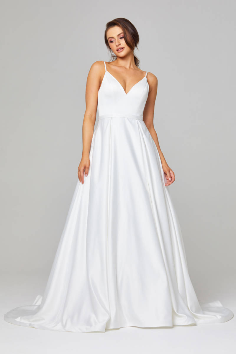 The Aurora A-line Wedding Dress TC304 by Tania Olsen Designs is a modern take on a classic bridal dress design. Featuring a V-neck style neckline, spaghetti straps from the bodice and a subtle belted waistband. The Aurora’s luxurious soft satin fabrication, full skirt and small train will be sure to make every bride feel like a million dollars. Spread your wings in the brand new Papillon 2020 collection from award-winning Australian designer Tania Olsen Designs. Sizes AU 4-30, Soft Satin, Fully Lined, Floor Length Bridal Dresses.