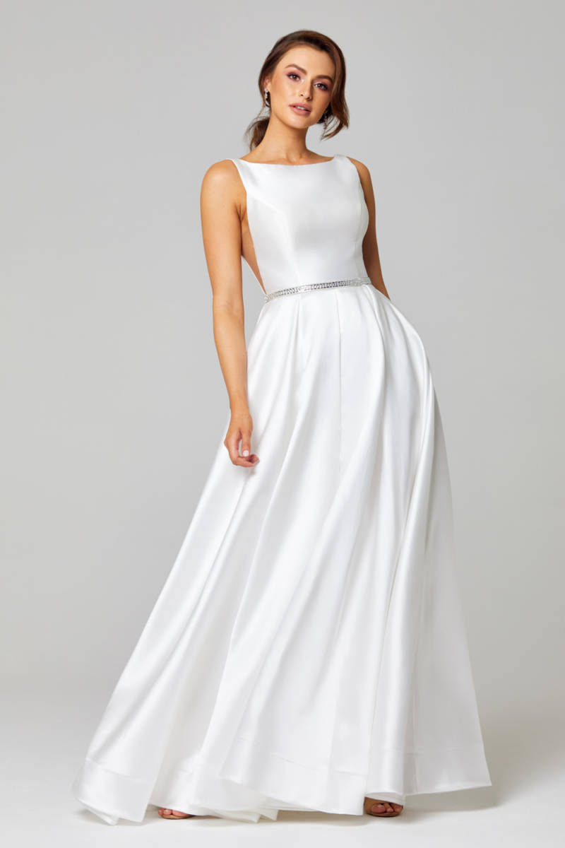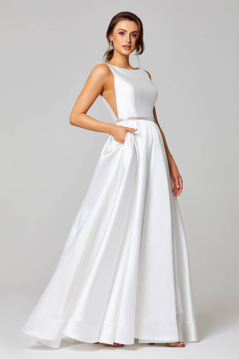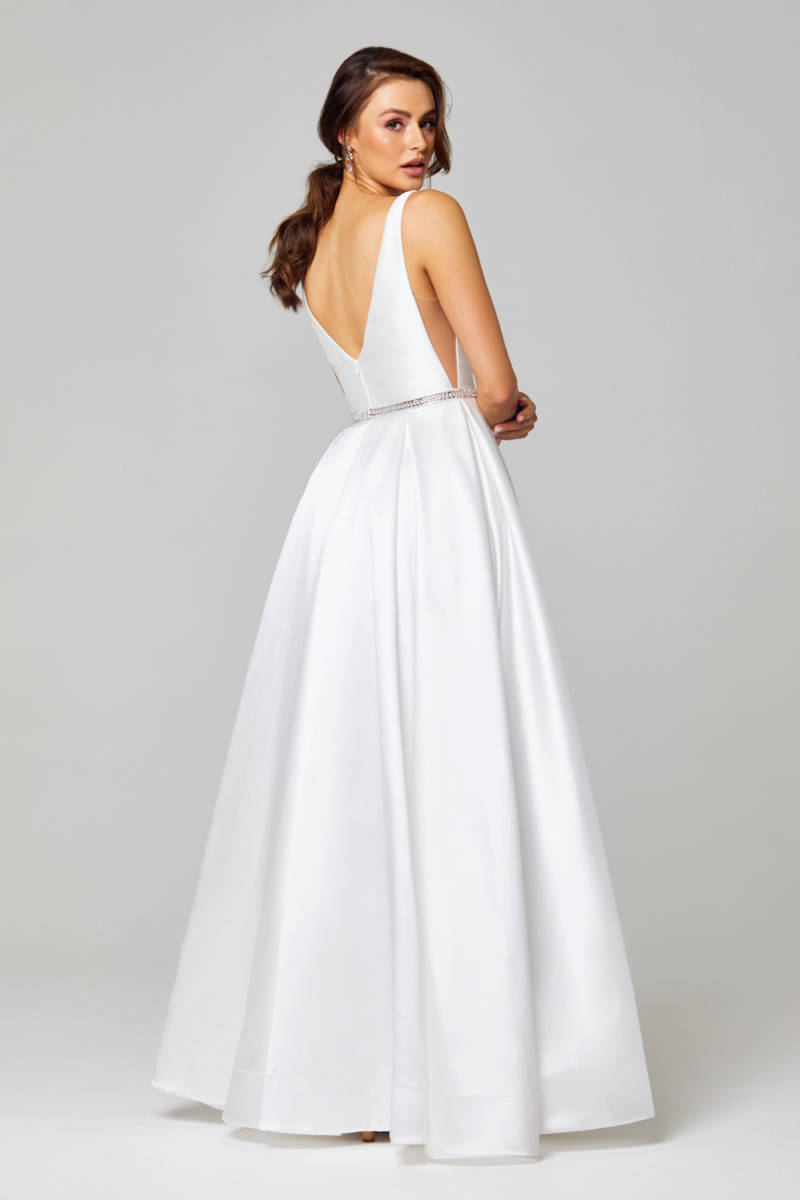 The Shari Satin Wedding Dress by Tania Olsen Designs is a sleek and glamorous A-line dress for the modern bride or debutante. The Shari dress features a high boat neckline and dramatic triangular cut outs with mesh coverage, complimented by a beaded metallic waistband. In addition, the shoulder straps fall to a low open back with zip fastening. The luxurious matt satin fabrication of this wedding or debutante dress will feel like a dream to wear and most importantly, it has pockets! What’s not to love! Spread your wings in the new Papillon 2020 collection from award-winning Australian designer Tania Olsen Designs. Sizes AU 4-30.