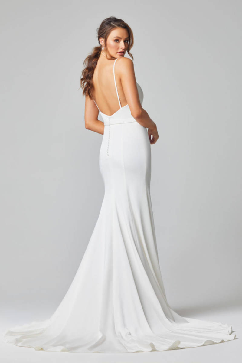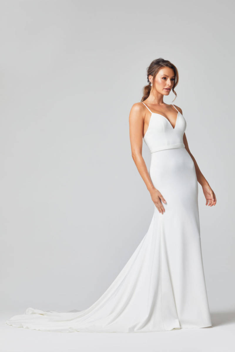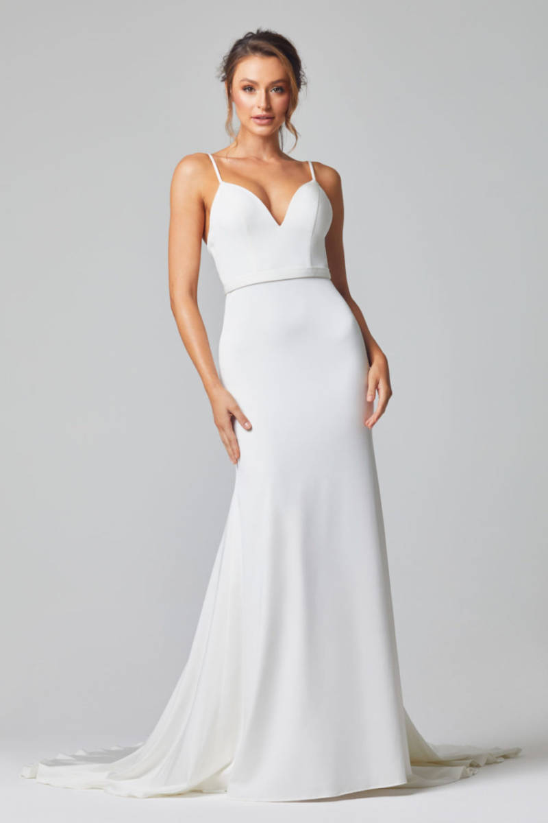 The Amara Matte Satin Wedding or Debutante Dress TC329 by Tania Olsen Designs is gorgeous will be sure to have all eyes on you! The Amara features a structured, plunging sweetheart neckline and a belted waistband that continues to the back. It is a flattering gown choice due to the thick matte satin fabric and the floor length skirt that flares from the upper leg into a gorgeous, subtle more a-line shaped skirt. This dress also features a show-stopping train that is sure to look amazing when you’re walking down the aisle on your special day. Available in sizes AU 4-30.