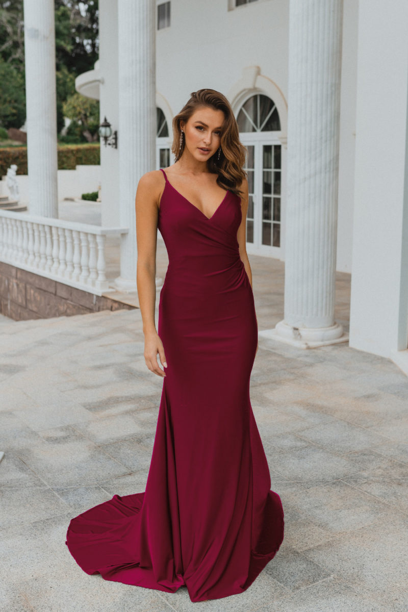 The Lima PO901 formal dress by Tania Olsen Designs is a striking gown that will have you glowing with confidence. The Lima features a structured bodice with a v-shaped neckline and gathering through the side. The thin straps sit over the shoulders and fall into a low v-shaped back with ruching over derrière. From the waistline falls a floor length skirt with a long train. The thoughtful design of the Lima makes it a comfortable and flattering choice for any height and bust size. The garment is crafted from a deluxe jersey knit fabric which has a delicate sheen that catches the eye. The Lima is available in Plum
