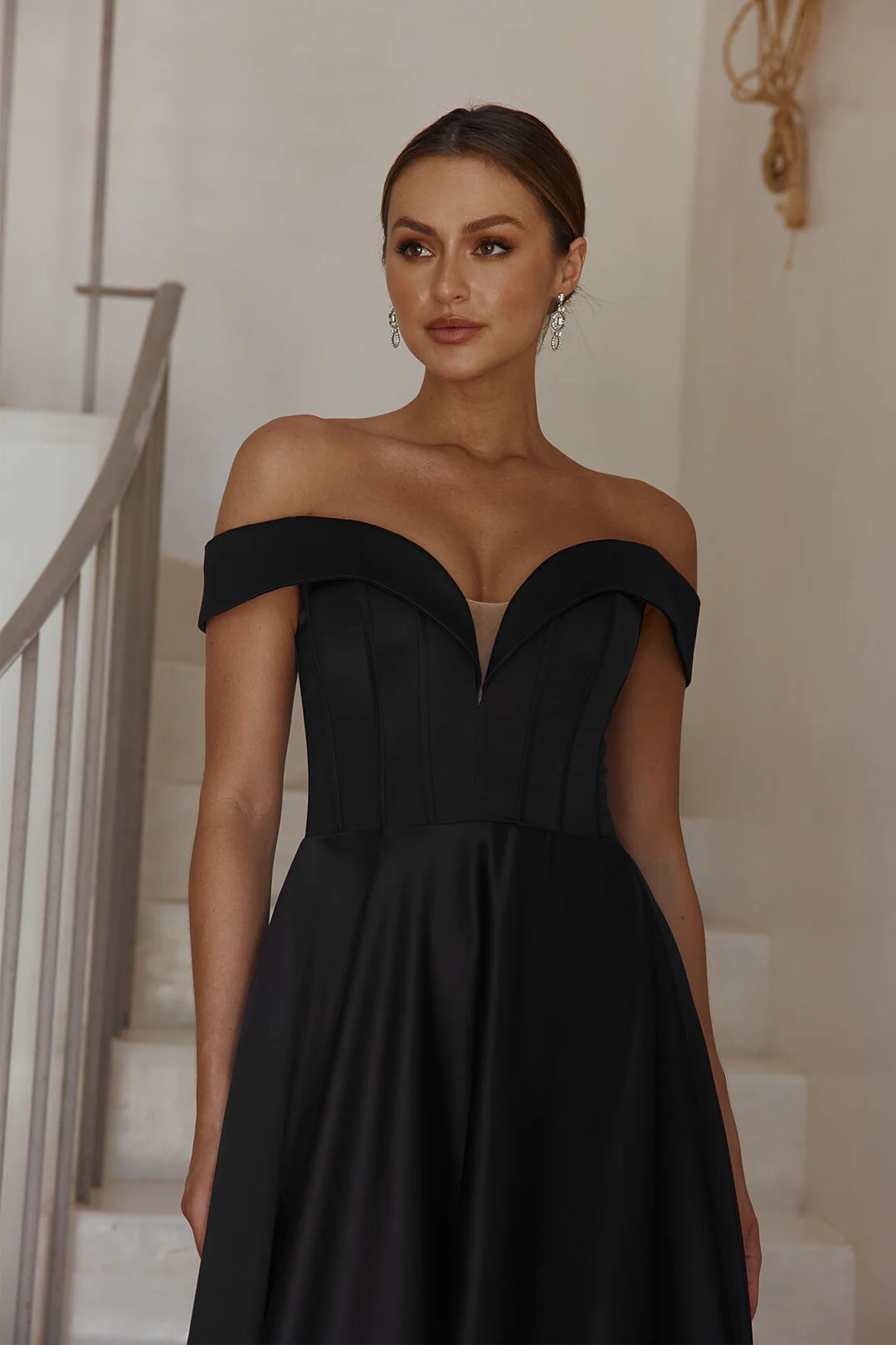 • Off-shoulder design with mid-plunge V-neckline for a modern, feminine touch
