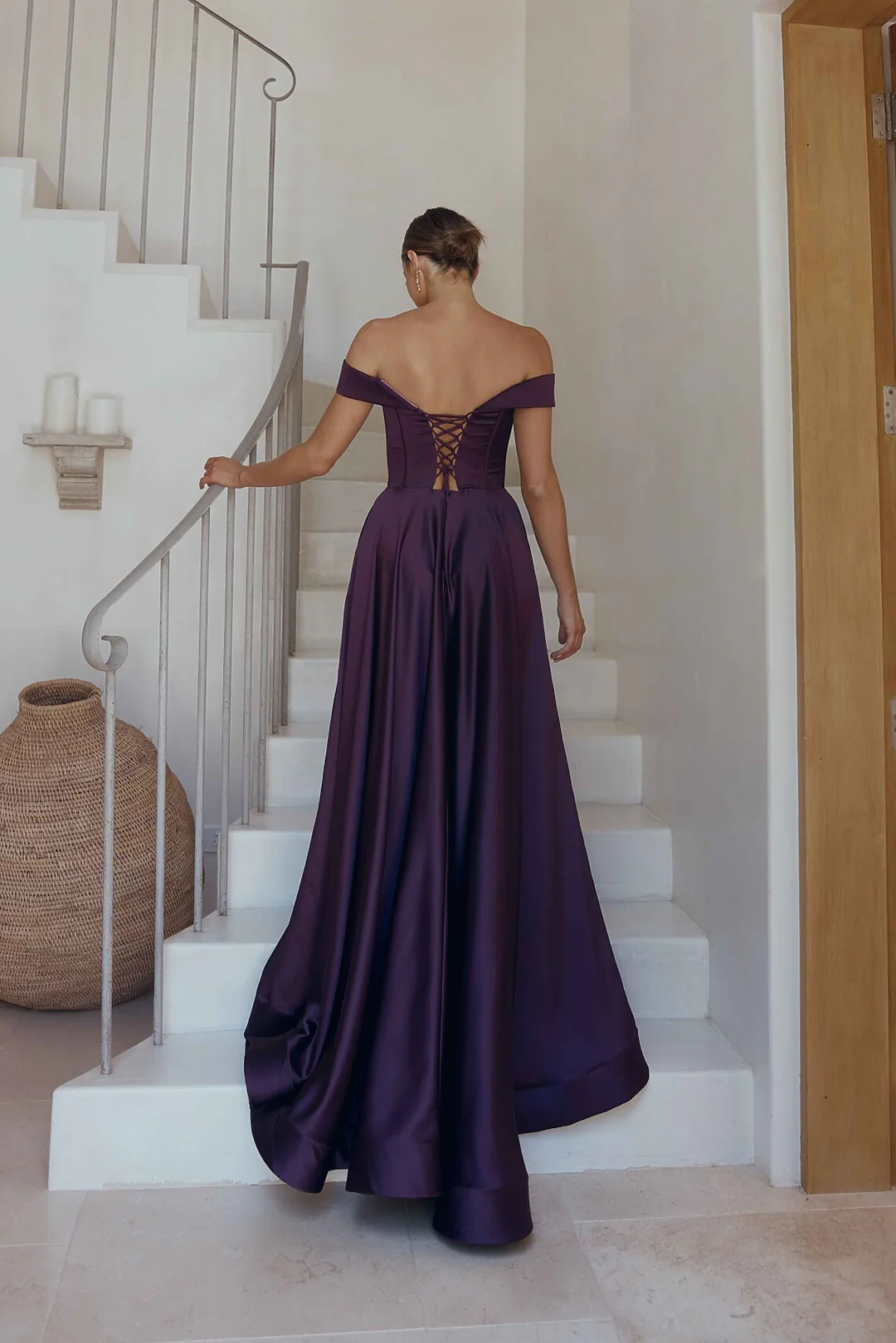 Made from premium satin fabric, the Willa dress radiates luxury and sophistication. The off-shoulder neckline paired with a mid-plunge V-cut bodice creates a flattering, fashion-forward silhouette. The exposed boned corset and lace-up back closure provide a custom fit that hugs your curves and enhances your figure.
