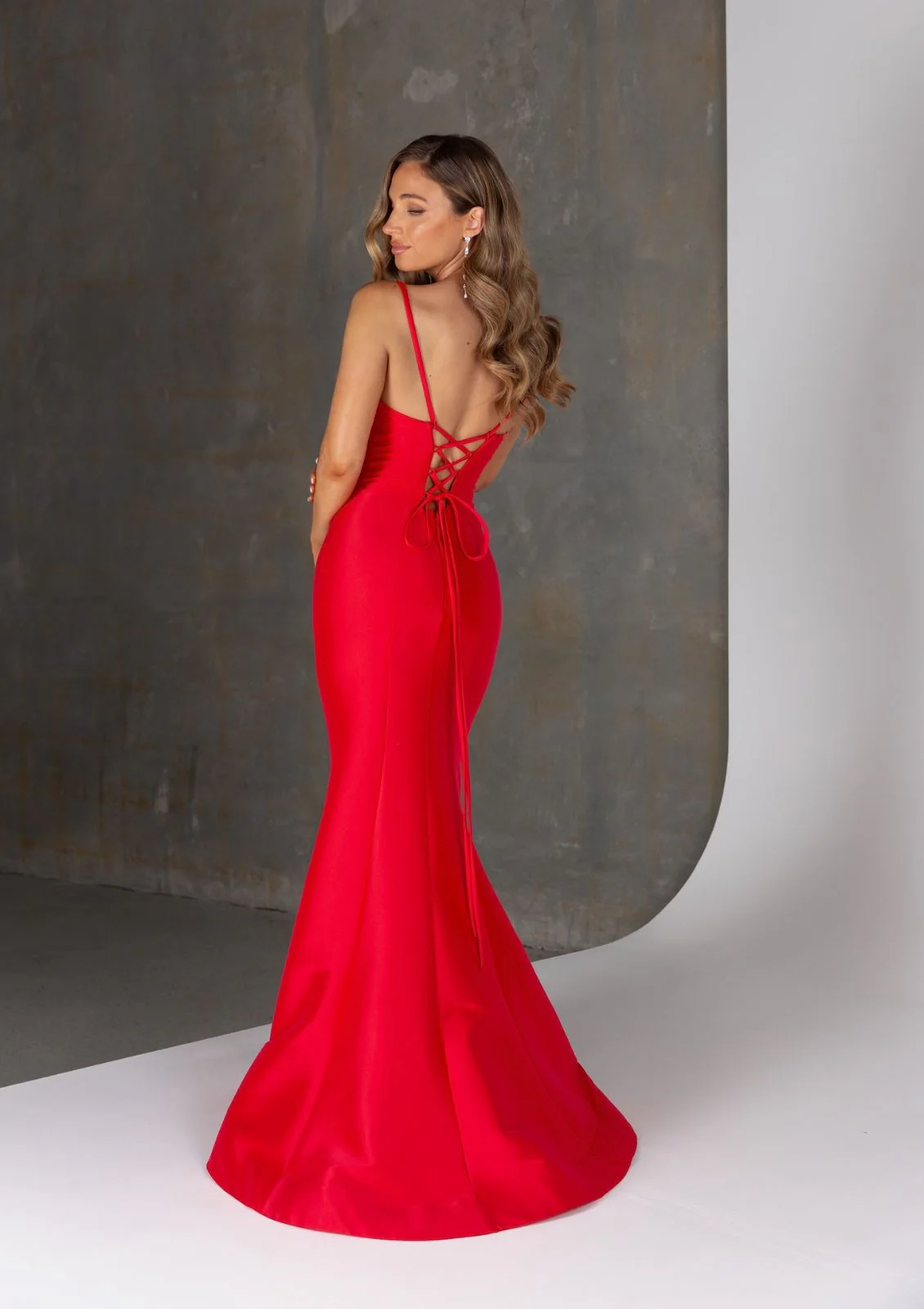Samira formal dress, Tania Olsen PO25155, red bow dress, stretch mikado gown, formal gown with mermaid hem, school formal dresses Sydney, statement bow formal dress, lace-up back evening gown, Northern Beaches formal wear, Azure blue formal dress