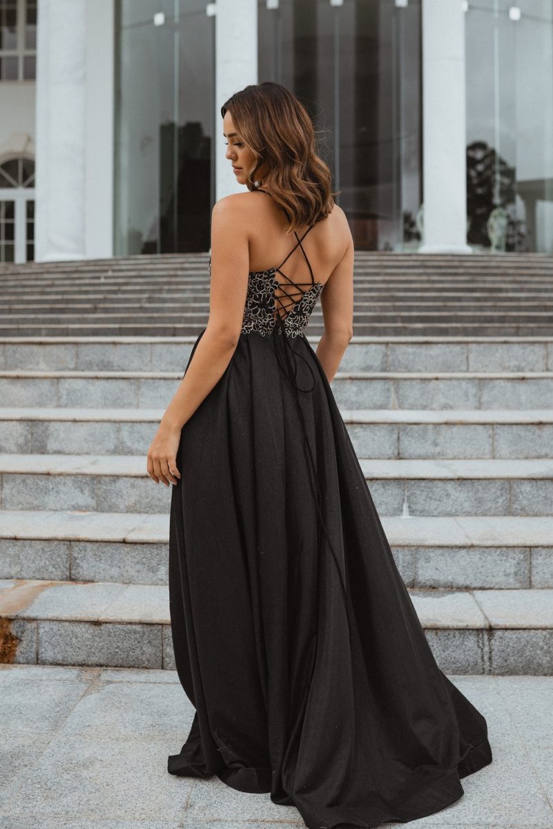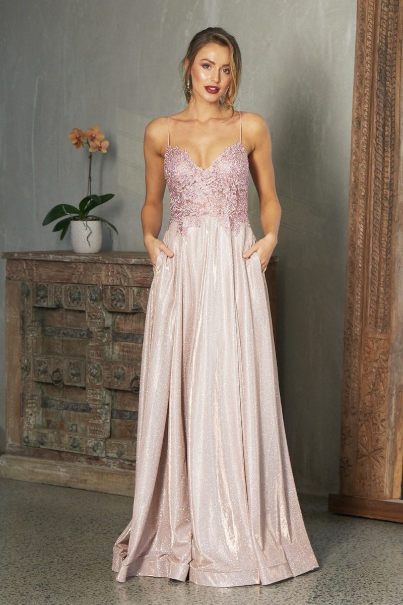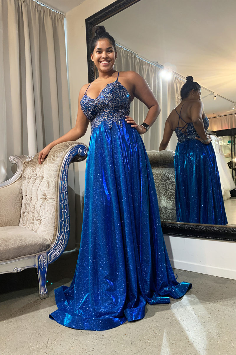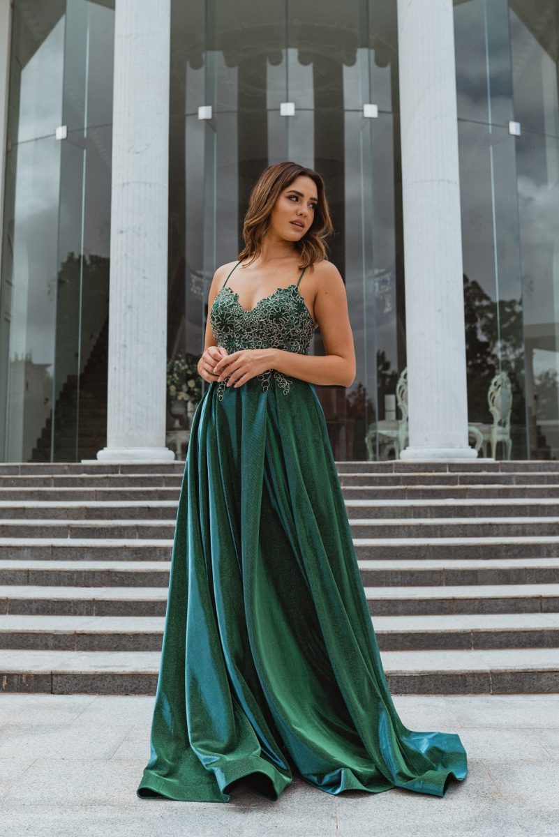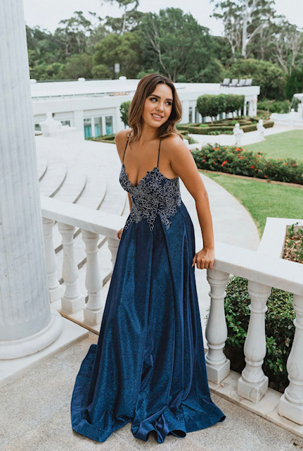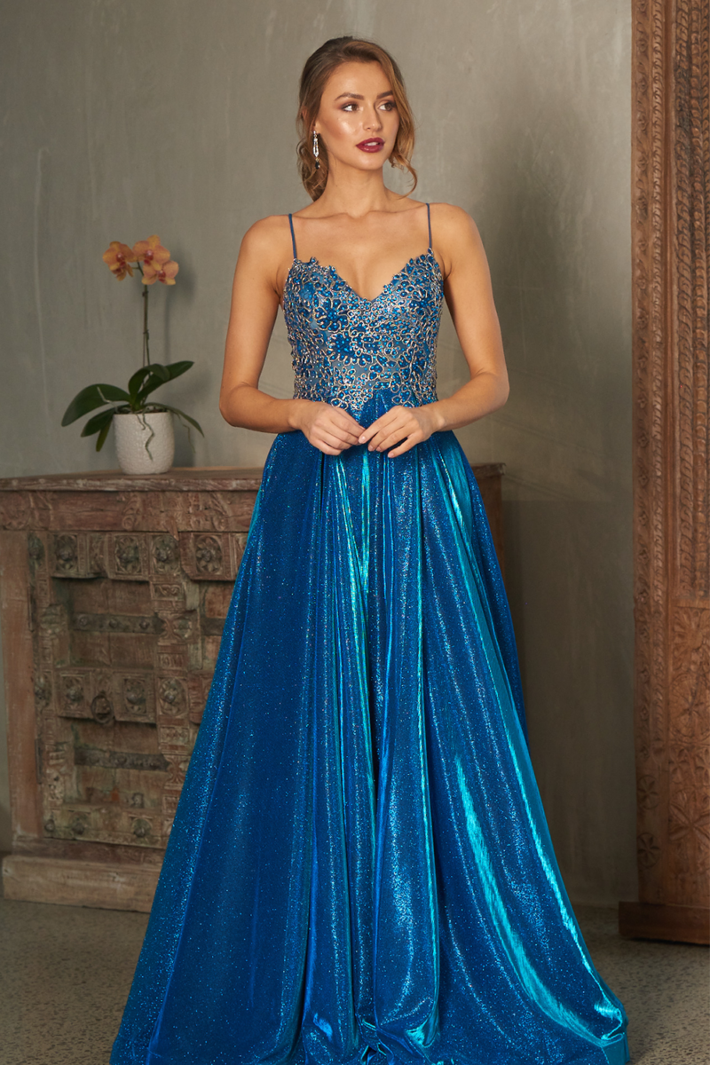 The Ivy Shimmer Formal Dress is what mermaid dreams are made of. The bodice is crafted from a gorgeous green lace applique stitched on with a glistening, regal gold thread. Emerald green beading is repeated along the V-neckline front, over the spaghetti strapping and across the back. The back of the dress features a tie-up corset detail with thin ribbon, making it a stunning style from all angles. Not to forget, the floor-length teal shimmer skirt changes colour in different lights. All eyes will be on you at your next formal event when wearing this gown.