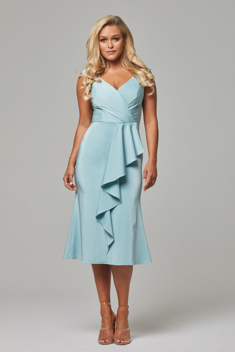 Cascading frill front detail the gorgeous Gabriel PO90 is a sweet modern cocktail dress. Fabricated of Semi-matte satin with a wide shoulder set v-neckline bodice, shaped through the waist with and falling into a slim line skirt. The back is fully enclosed, perfect for wearing a bra with an invisible zip for a smooth finish closure.