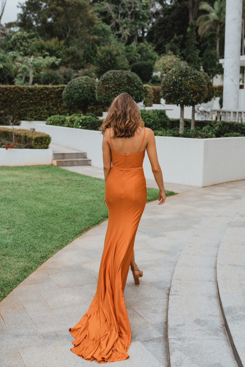 The Manila square neck formal dress PO900 by Tania Olsen Designs is an elegant design perfect for your next formal event or sunset soiree. The Manila features a structured bodice with a square neckline set with thin straps that fall over the shoulders into a square shaped back. From the thinly belted waistline falls a fitted mermaid silhouette skirt with a high leg split and dramatic train. One of the design features of this dress is the panelling throughout the bodice and train which helps to create a sleek and well fitting dress. The Manila is crafted from a deluxe jersey knit fabric. If you’re looking for a stand out dress that is also comfortable to wear, then this is the perfect gown for you! It’s available in Burnt Orange