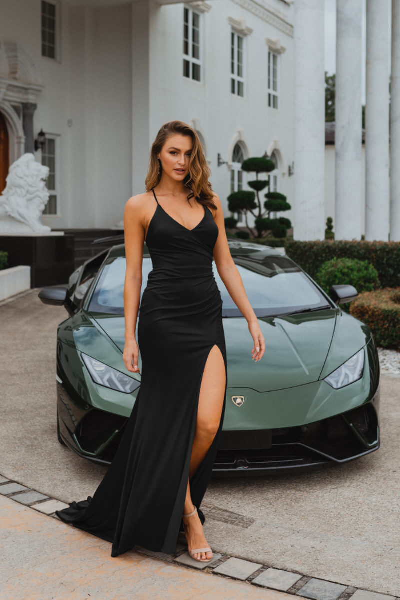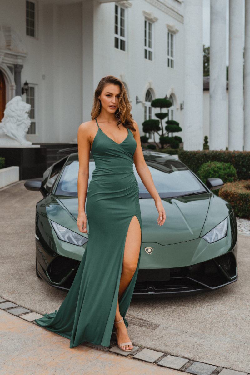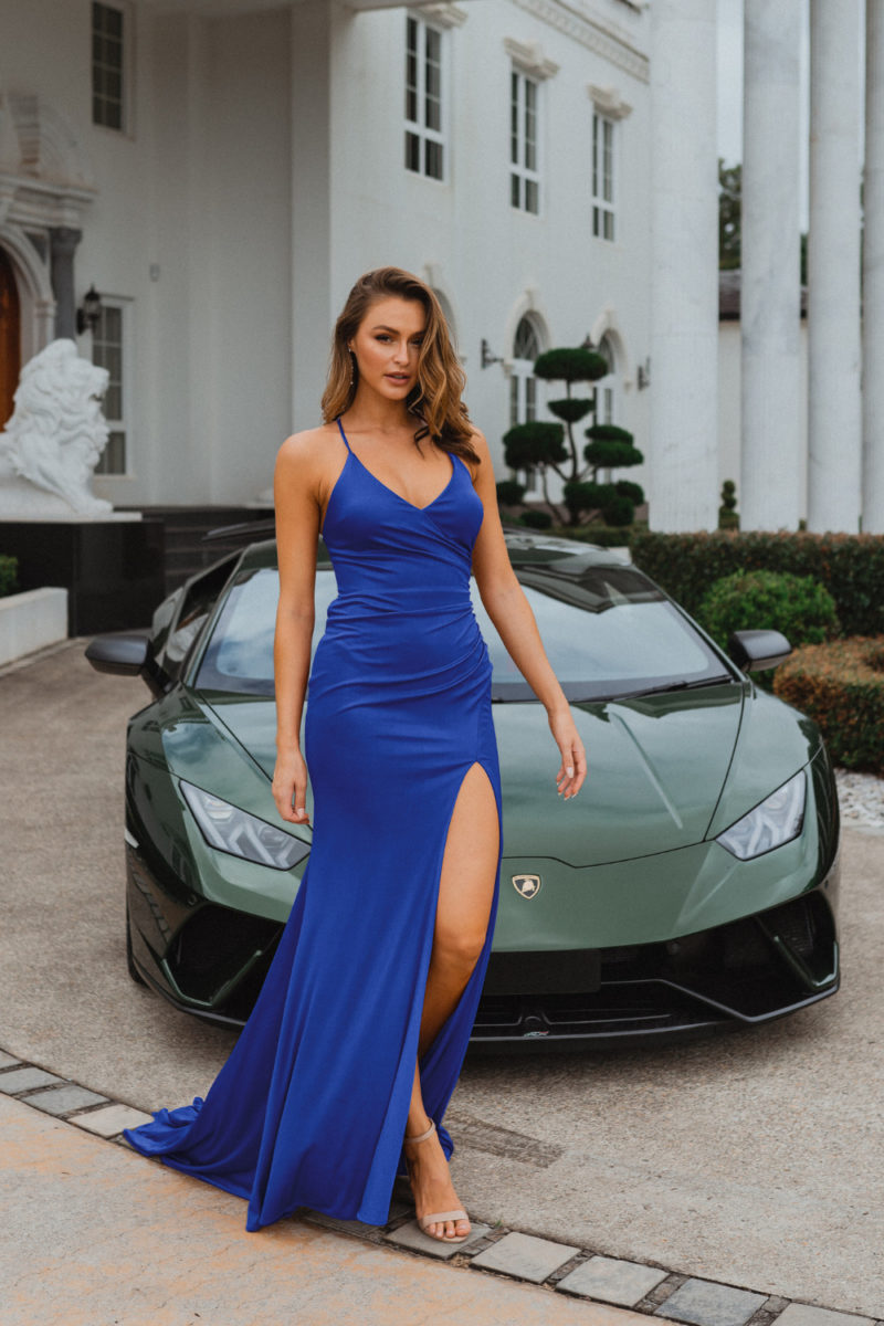 The Milton Low Back formal dress PO917 by Tania Olsen Designs is best worn with sparkling chandelier earrings and a bold lip. The Milton features a soft bodice with a scoop neckline and spaghetti straps that meet a low tie up back with ruching over the derrière. From the waistline falls a floor length skirt with a high leg split and gathering details through the middle; making it a comfortable and flattering choice for any height and bust size. The garment is crafted from a deluxe jersey knit fabric which has a delicate sheen that catches the eye. The Milton is available in Forest, Red, Navy, White, Cobalt, Aqua, Black, Burnt Orange, Pale Blue, Lilac, Sage and Rose Pink in sizes AU 2-20.
