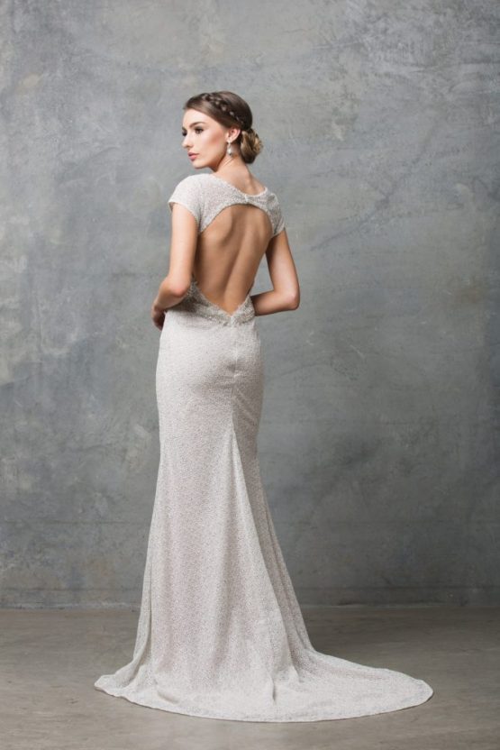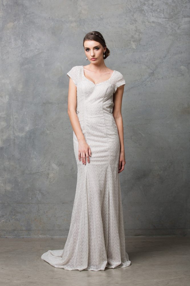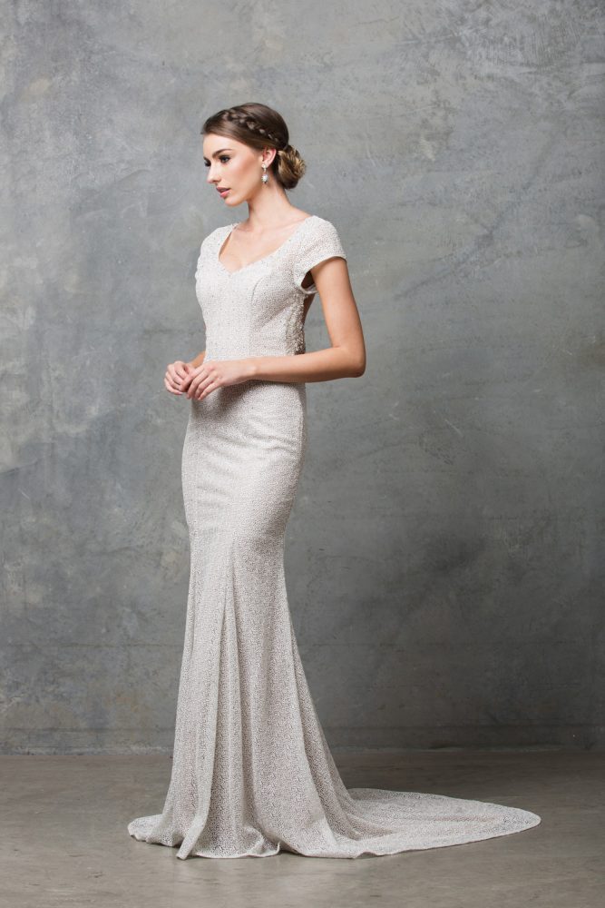 Fine lace embroidered and all over jewelled v neck cap shoulder slim Ball gown or wedding gown with large open key hole back and jewel applique!. LAST ONE LEFT
